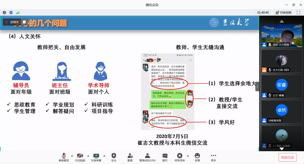 为帮助广大考生和家长朋友们更好地深入了解吉林大学,解答大家有关报考和就读方面的问题,7月26日晚,我校湖北省本科招生宣传线上宣讲会通过网络会议平台成功举办。