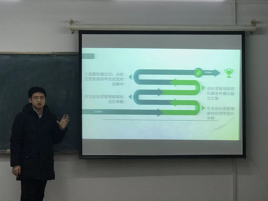 活动中,吕明轩就文案撰写、时效问题、流程问题三个部分展开具体培训,讲解了社团活动策划格式的规范标准,强调了社团审批过程中的时效问题,并通过列举社团活动的具体案例,明确了社团活动各项工作文件提交的时间期限。活动最后,各学生社团的相关工作人员就具体细节进行了提问。