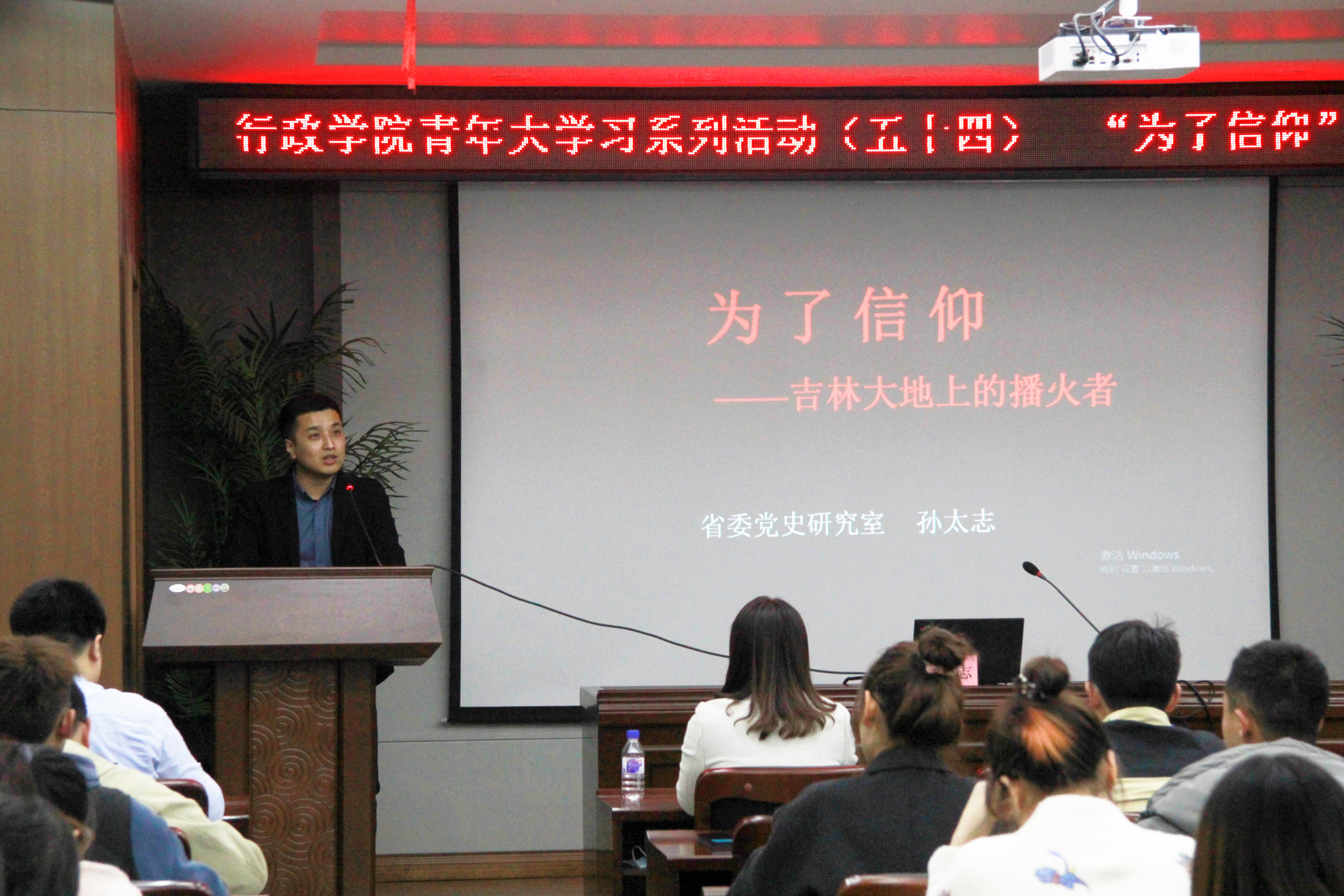 为深入学习贯彻习近平总书记在党史学习教育大会上的重要讲话精神,进一步增强青年学生信念感和使命感,行政学院团委于3月24日在东荣大厦B303室举办“为了信仰——吉林大地上的播火者”专题党课。省委党史研究室专家孙太志作为特邀嘉宾到场授课,院党委副书记兼副院长史慕华出席,辅导员刘洋主持会议。学院研究生党支部、本科生党支部、青年学习班(第三期)成员及本科生班级团支书参与活动。