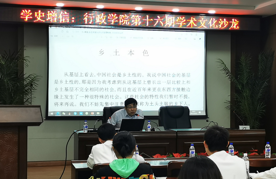 5月25日晚,《行政之光》杂志社于中心校区举办了“学史增信”主题第十六期学术文化沙龙。本期学术文化沙龙邀请到了我院政治学系丁建彪副教授作为主讲嘉宾,为大家带来了题为“费孝通《乡土中国》中的中西思想与文法之风”的分享。本期学术文化沙龙由畅达禹同学(2019级本科生)主持。