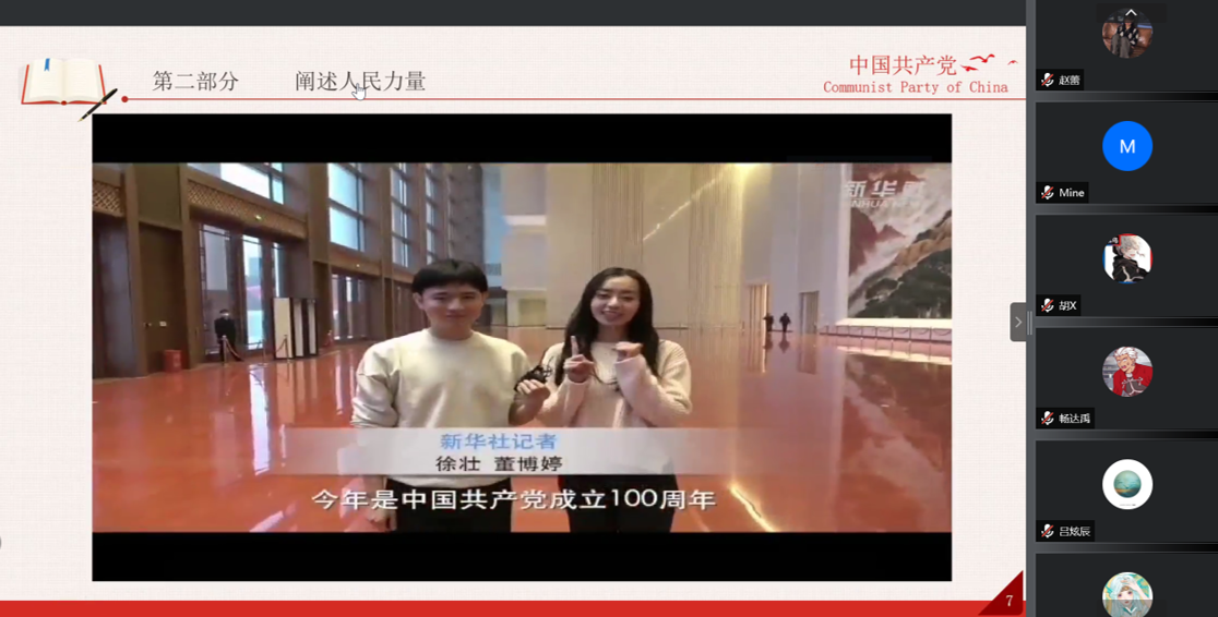 本次团日活动,2019级各班团支部以线上学习方式,进行三个环节的深层次学习:学习解读、材料分享、总结收获。各班团支书以中国共产党百年奋斗历史为主线,带领同学解读《公报》内容,同学们认真学习、积极思考,学习了解《中共中央关于党的百年奋斗重大成就和历史经验的决议》的重要意义和时代价值,并结合抗疫实际,从平凡英雄角度,阐述人民力量。在材料分享环节,各班同学踊跃发言,分享自身的学习感悟。高苗苗(2019级本科生)认为青年会在接续奋斗中以“功成不必在我”的思想境界和“功成必定有我”的责任担当,为祖国社会主义建设事业的发展贡献青春力量;赵蕾(2019级本科生)和刘梦瑶(2019级本科生)也表示,实现中国梦必须要靠人民群众,新时代大学生应扎扎实实学精神、原原本本悟思想,在学思践悟中培育本领、汲取力量,以昂扬风貌迎接党的二十大胜利召开。活动最后,各班团支书总结发言,并通过会后感想撰写的方式,引导广大团员青年感悟时代精神、坚定理想信念,在“第二个百年”征途中继续为中国特色社会主义事业奋斗!