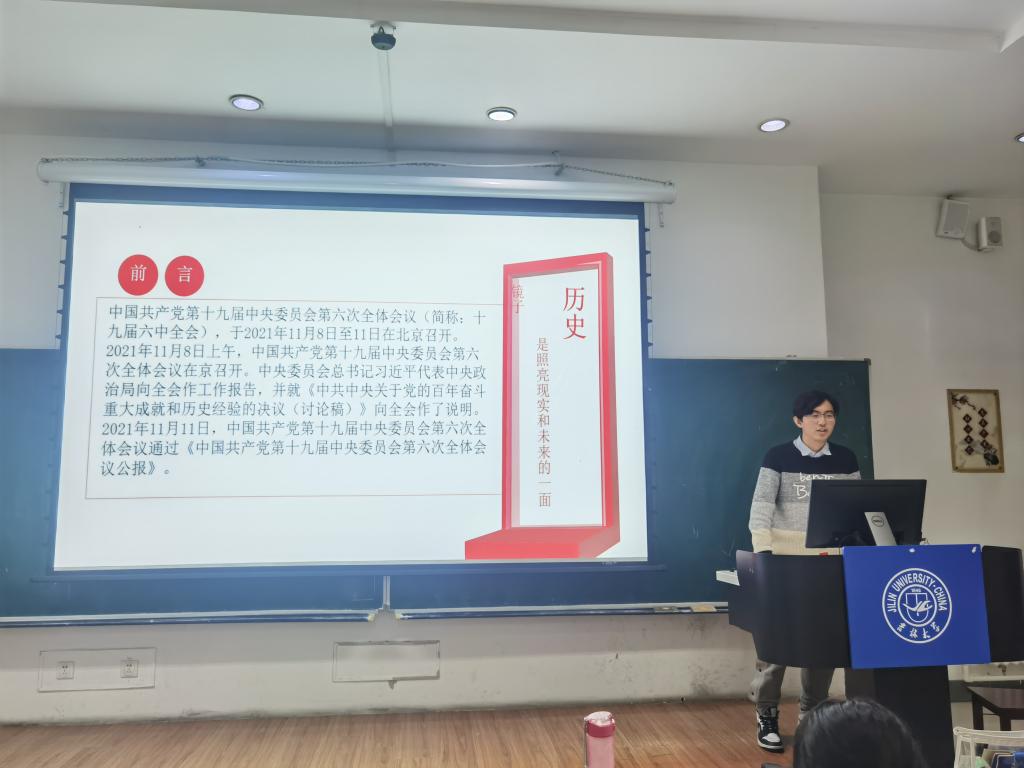 各班团支部通过材料解读、视频观看、交流感想三个部分对十九届六中全会公报进行了深入学习探讨。各班团支书结合学习材料,阐释了在当今的特殊历史条件下总结党的百年奋斗经验的重要性,分享了党的百年奋斗征程中所取得的实践经验与核心要义,并从“时代、党史、青年”三个角度梳理了会议的积极作用,引发同学们的思考;接下来,通过观看关于《中共中央关于党的百年重大成就和历史经验的决议》的新闻报道,同学们对十九届六中全会有了更为系统全面的了解认识;活动最后,各位同学热烈讨论,积极发表自己的学习思考:曹阳(2021级本科生)认为,伟大成就催人奋进,宝贵经验昭示未来,我们要承前启后,继往开来,继续完成伟大使命;黄琴、刘雪莹、裴传明、郭长平、满运璋、赵梓含等同学也针对此次学习内容进行交流,纷纷表示青年学子要保持初心,听党话、跟党走,努力增强科学文化知识水平,牢记使命担当,走好新时代的赶考路!