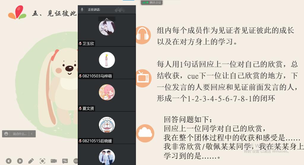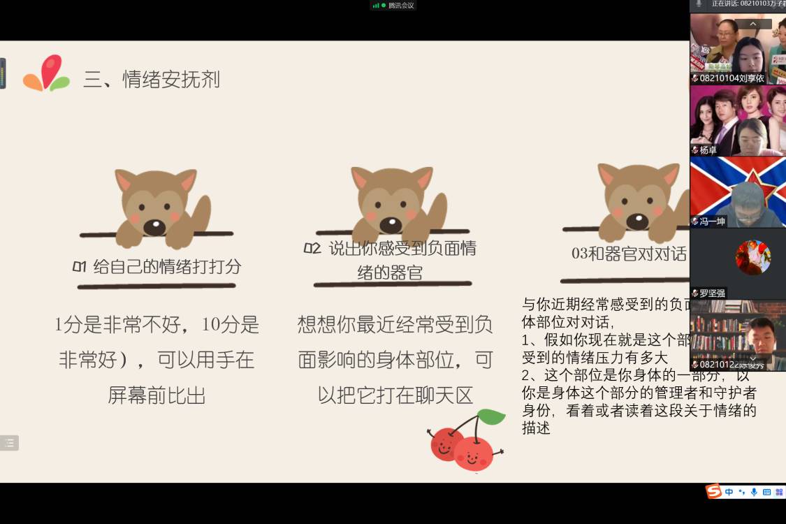 20日下午,2021级3班首先开始主题班会活动。心理委员向3班同学介绍本次活动目的及相关规则,引导同学们打开摄像头,进行“摇摆时钟”线上热身活动,更好的调动了同学们的参与积极性。24日下午,2021级2班、4班、5班相继开展主题班会。在“情绪安慰剂”“不烦躁的理由”“我的一天”等环节中,心理委员们鼓励同学们说出封寝中的所想所感,不少同学还拿出纸笔,将自己的情绪绘成生动的图画,将自己的“宅寝”的心路历程与大家分享。各班班会持续一个半小时左右,达到了“在线沟通,心灵畅通”的良好效果。