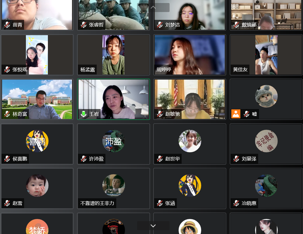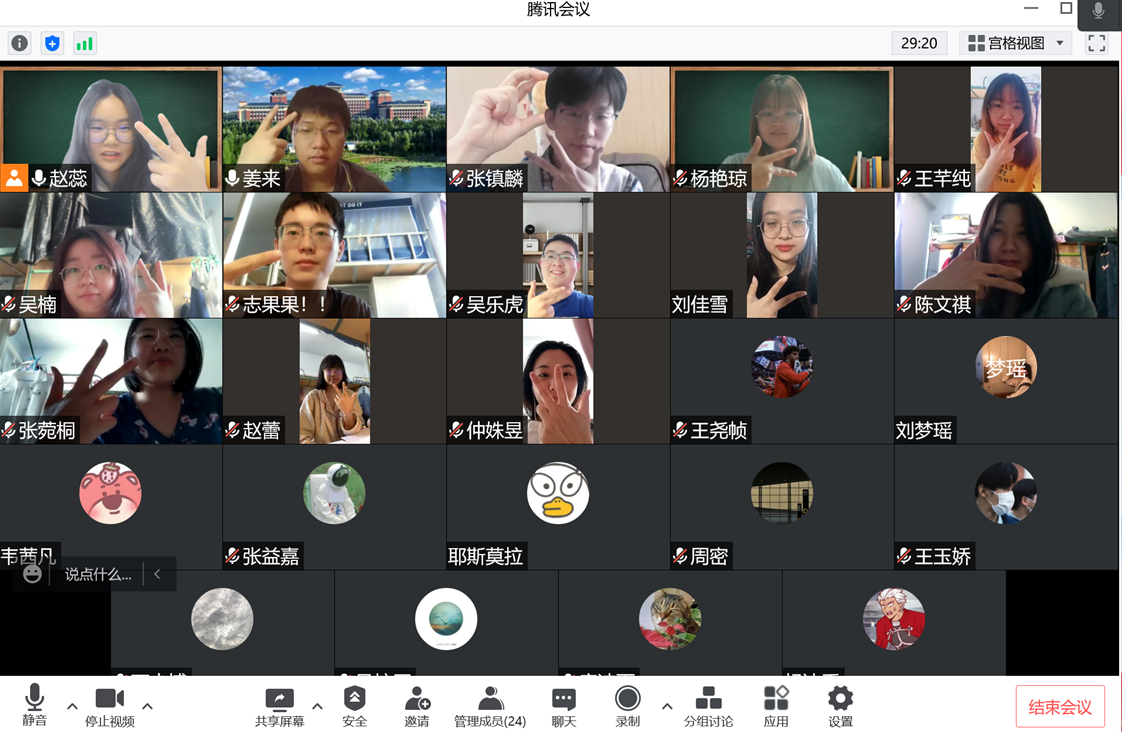 26日晚,在2019级二班班会上,班主任王娜老师与28名同学通过线上腾讯会议的方式开展了本学期第二次班会暨疫情期间心理疏导课。班会伊始,王老师针对第二期班会主题进行发言,活跃班会气氛、提高同学们的讨论积极性。王逸洲、于泽龙同学首先分享了寝室隔离期间室友间的温馨互动以及个人感受,为其他同学提供了隔离期间身心调节的可行经验。在随后的自由交流环节,梁恩昊、黄家琪、于泽龙、王炜冬等多名同学针对寝室隔离期间生活物资采购品类的增加问题提出自身需求并希望学校与学院能够提供相应帮助。王老师认真倾听同学们的心声,及时为同学们提供建议,并表示将向学院进行反馈,帮助同学们解决生活问题。最后王老师向同学们分享自己再封闭管控期间的生活趣事与海外留学期间的丰富见闻,以此鼓励同学们在寝室隔离期间树立积极乐观的心态,潜心认真进行专业学习,不断追求更多的进步,实现自身的远大理想。
