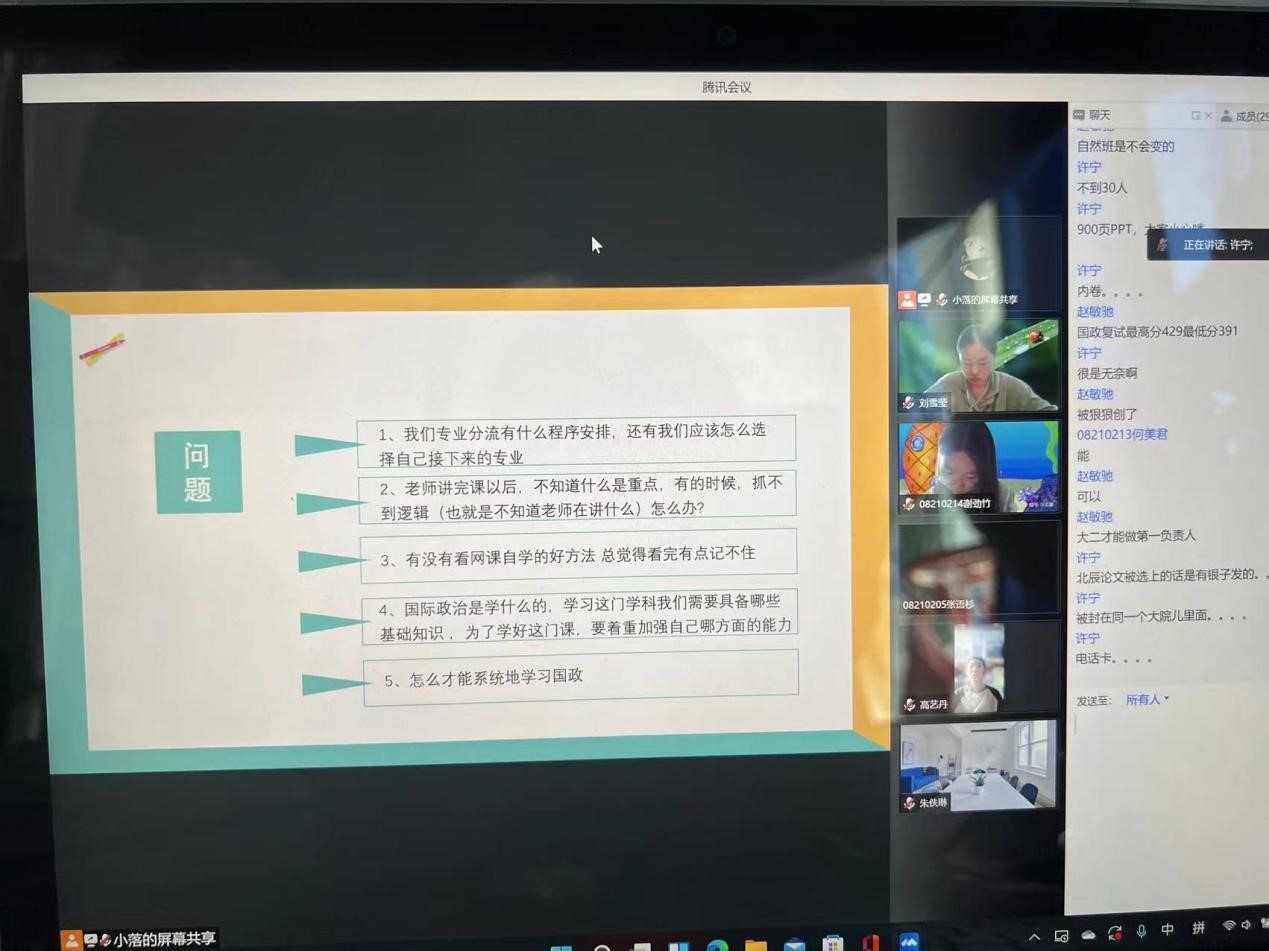 3月25日,在2021级二班的班会上,刘畅、许宁两位班主任老师与各位同学开展第二期线上主题班会。会议伊始,罗舒连同学总结了二班各位同学各自的计划完成情况。紧接着,班会进入到计划完成情况的个人汇报环节:刘冉同学分享了关于《毛泽东选集》的阅读心得,认为青年人要有自己的思考,在看待问题时要从整体出发;高艺丹同学分享了关于英语和阅读两方面的计划。随后,两位班主任针对同学们提出的问题给予了专业且通俗易懂的回答。刘畅老师就专业分流、国际交流等同学们关心的问题进行了细致解答;许宁老师认为国际政治的学习需要掌握扎实的政治学知识,同时要开阔自身视野,并建议同学们在封寝期间静下心来,多多阅读学术报告,以提高自己的学术思维和学术能力。