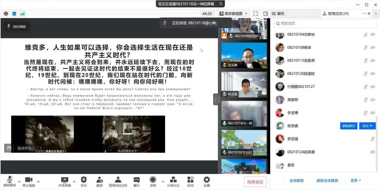 在2021级一班的班会上,刘享依、万子君、赵莞昕同学通过分享近期观看的电影、书籍和短片,用文字引发同学共鸣,给予满满温暖;冯一坤同学用流利俄语介绍《歌唱动荡的青春》,鼓舞人心且回味无穷;扎西拉姆同学介绍自己家乡西藏,让大家享受了一次云游雪山的奇迹体验。班主任林奇富、田玉麟老师首先对四位同学的分享进行点评,为同学们积极准备、传递知识的行为表示肯定,并号召同学们在大学期间开拓自身视野、增长见识、提高本领,学习新技能,以更好地适应未来就业竞争新形势,做到课堂理论与社会实践结合。同时两位老师鼓励同学服从学院与学校安排,克服封寝困难,保持信心,坚定信念,共盼花开。