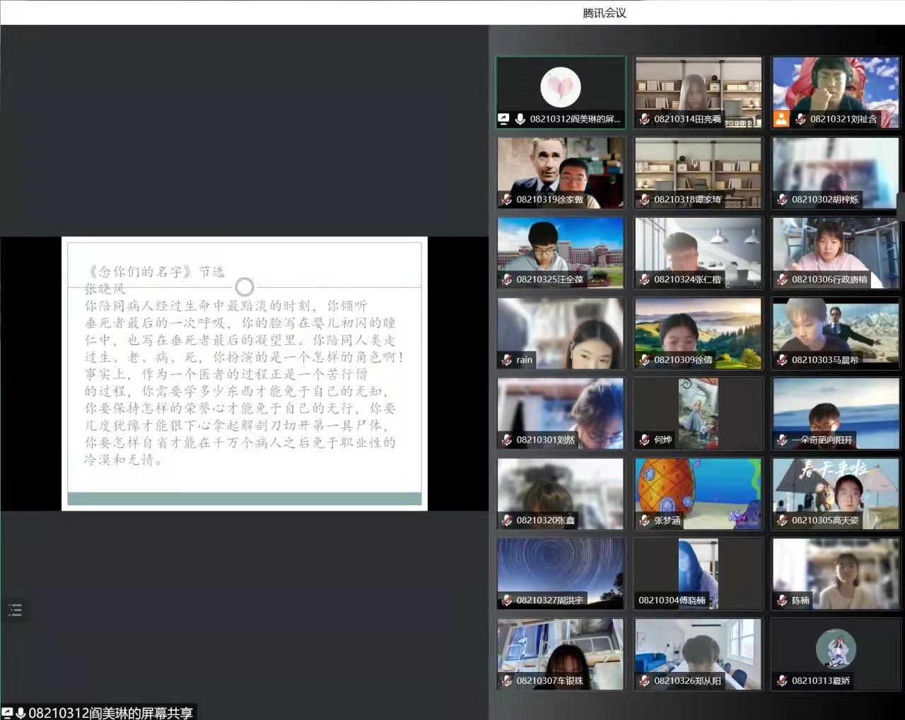 2021级三班的班会由刘祉含同学主持,通过读书分享形式开展班会。首先,陈布时、徐家傲、阎美琳同学分别从近代诗作、中国历史等角度分享了自己的读书感悟。其次,班主任郭锐老师、王岩老师分别对以上同学发言进行点评,对他们认真准备分享、充分展现的饱满学习热情点赞支持,同时也希望同学们在图书阅读中提升自身的综合水平,感受书籍世界的绚丽多彩。此外,两位班主任老师还向同学们表达慰问与关心,勉励同学疫情期间虽然封寝在校,但学习和生活不要松懈、继续严格要求自己,踏实奋进努力学习,在解封之后,看到一个完美的自己。