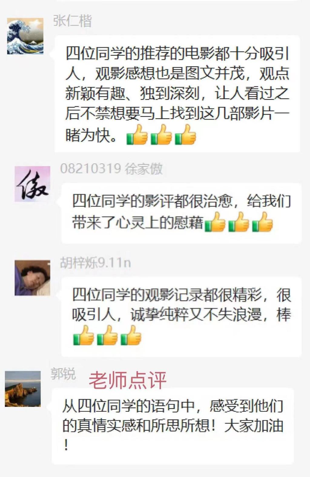 2021级三班班会由刘祉含同学主持,班主任王岩老师与郭锐老师组织大家进行观影交流会。傅晓楠、何烨、夏娇、郑从阳同学分享了《伴你高飞》《中国医生》《彩绘新天地》和《天气之子》四部电影的观影心得。王岩老师和郭锐老师感受到了同学们乐观向上的积极心态,对精心准备的分享内容表示赞赏。班会最后两位老师指出,在封寝状态下,希望同学们可以从电影中感悟世间真情流露,体会生活背后的酸甜苦辣,学到人生成长的点点滴滴——充满信心,跨越苦难,向阳而生。
