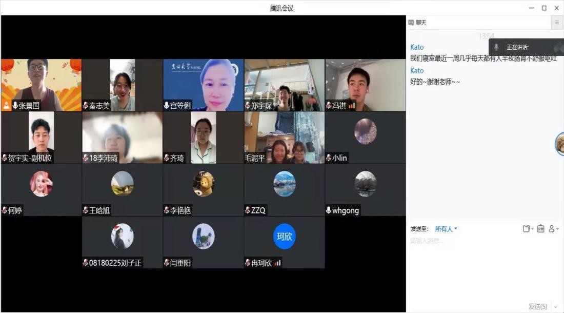 4月14日下午,行政学院2018级二班的各位同学与龚蔚红、宫笠俐两位班主任老师再聚线上,举行第五期抗疫主题班会。龚蔚红老师首先了解了同学们近期的学习生活状态,帮助大家进行情绪疏导与日常学习规划,提醒大家要遵守疫情防控规定,积极锻炼身体。宫笠俐老师耐心解答了班级同学有关于毕业论文问题,提到同学们要重视毕业论文,多与论文指导老师沟通,规范具体写作格式,同时也要珍惜这次写论文的机会,给自己的本科阶段画上一个圆满的句号。两位老师也为即将读研的同学提出了“提前和导师联系、不要荒废时间”等学业建议。关于班级同学提出的就医、饮食等生活问题,两位老师也及时解答,积极帮同学们向学校反馈正当需求。