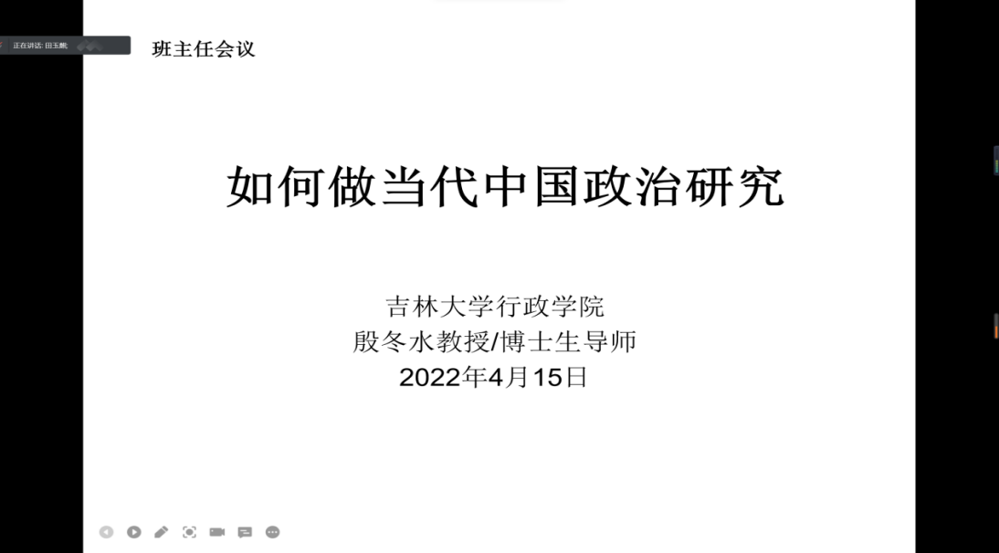 4月15日晚上,殷冬水、董伟玮两位班主任老师与行政学院2018级四班的各位同学通过视频会议的方式开展了本学期第五次抗疫主题班会。此次班会由殷冬水老师主讲。殷冬水老师首先关心了同学们的封校情况,详细了解了同学们的学习生活情况。针对一些同学即将读研的情况,以“如何做当代中国政治研究”为主题进行了讲解。殷冬水老师介绍了政治学研究的发展阶段及变化,重点讲述了为什么以及如何做好当代中国政治研究,为同学们今后的研究生学习提供了指导性意见。