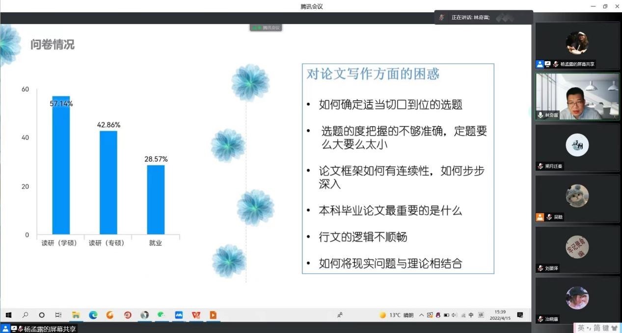 4月15日下午,2019级一班开展本学期第五次线上班会。此次班会以“论文分享与问题解析”为主题,班主任林奇富老师、王岩老师与28名同学参与本次班会。首先,学习委员杨孟露同学向大家介绍会议流程,并分享了事先准备的论文写作问卷结果。随后,张涵同学向大家分享了自己题为“闽南居民的王超中国认同:民间信仰的政治想象——以闽南地区王爷信仰为例”的论文。两位老师详尽解答了张涵同学的问题,启发其他同学在学术写作方面进行自我提升。最后,同学们就一周以来在学习中遇到的问题和困惑,与两位老师进行了交流。林奇富老师和王岩老师结合自身体会,鼓励同学们在疫情防控的最后关头保持良好心态、合理规划时间,为生涯道路奠定坚实的基础。