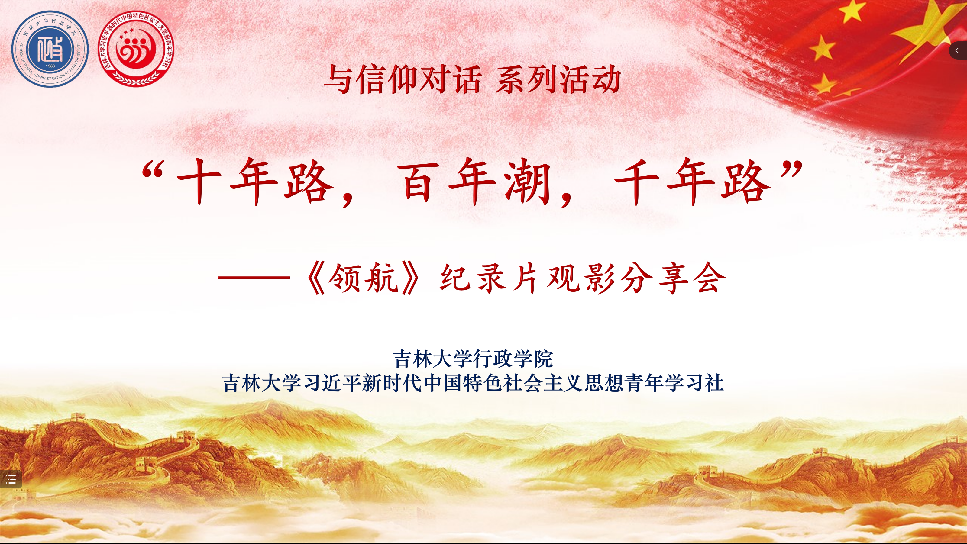 为深入学习宣传贯彻党的二十大精神,引导行政学子学习贯彻习近平新时代中国特色社会主义思想,鼓励青年学生踔厉奋发、笃行不怠,吉林大学习近平新时代中国特色社会主义思想青年学习社于2022年11月13日上午在线上成功举办第四期“十年路,百年潮,千年路”——《领航》纪录片观影分享会。