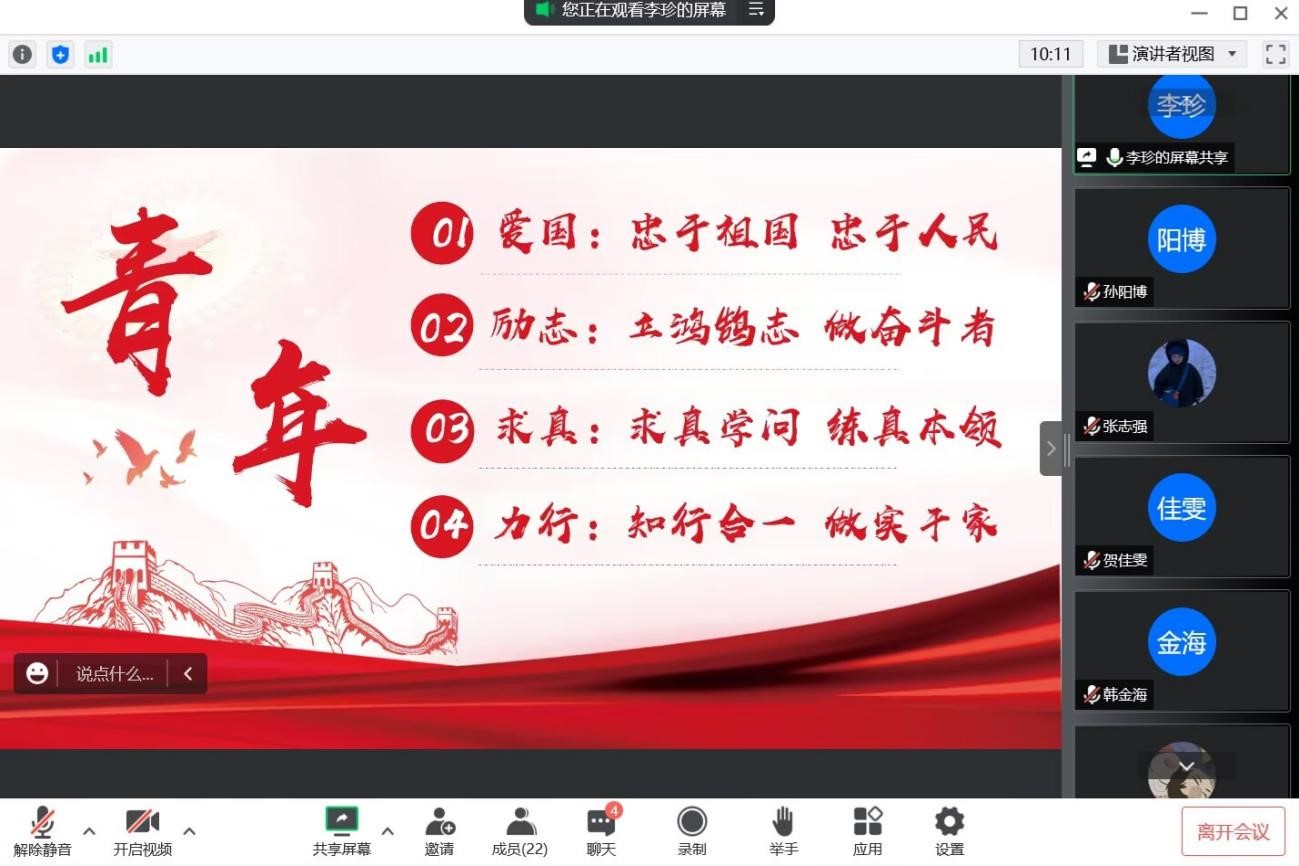 本次团日活动共包含学习解读,交流分享,总结收获三个环节,其间同学们认真思考、积极参与。活动伊始,各班团支书详细介绍了习近平总书记在北京大学考察时讲话的具体内容,深入阐述了习总书记提出的“爱国、励志、求真、力行”的深刻内涵,并寄语同学们,作为新时代的中国青年,要努力成长为德智体美劳全面发展的社会主义建设者和接班人,让中华民族伟大复兴在奋斗中梦想成真。在交流分享环节,李珍(2020级本科生)引用总书记的话语,强调广大青年要忠于祖国、忠于人民;立鸿鹄志、做奋斗者;求真学问、练真本领;知行合一、做实干家。苏小荔(2020级本科生)和吴晓彤(2020级本科生)两位同学则围绕总书记的“八字箴言”,表示了自身踔厉奋发、笃行不怠的决心,并鼓励同学们响应号召,做民族复兴的追梦者与圆梦人。活动最后,各班团支书总结归纳了同学们的发言,结合习近平总书记的讲话精神与日常的工作学习,呼吁大家牢记总书记的嘱托,在“团结起来,振兴中华”的时代强音感召下,一起书写无愧于时代、无愧于历史的华彩篇章。
