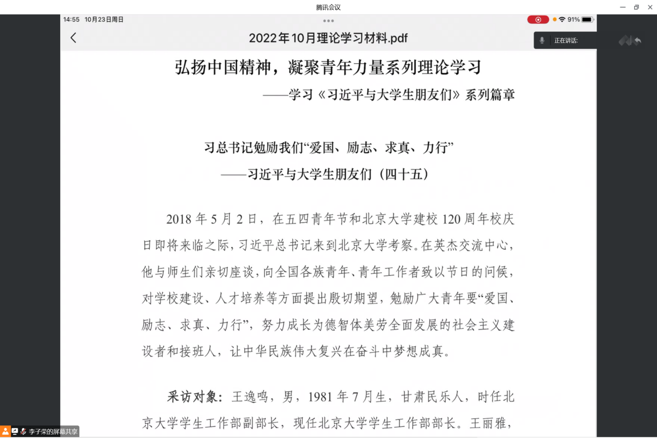 通过此次对《习近平与大学生朋友们》相关内容及精神的学习,同学们更加坚定了将个人发展与时代要求结合起来,将个人价值融入党和国家的伟业之中的信念。此次活动也激励广大团员青年努力成长为德智体美劳全面发展的社会主义建设者和接班人,凝心聚力擘画复兴新蓝图,团结奋进创造历史新伟业!(图文:行政学院2020级团支书及宣传委员 责编:行政学院学生会新闻宣传部)