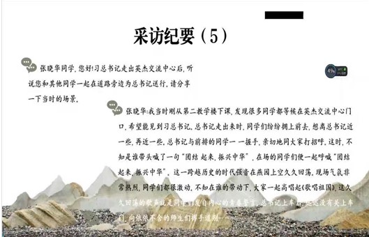 第二部分,材料精读环节。赵怡初(2021级本科生)为大家领读对话实录。张梦涵(2021级本科生)、马晨希(2021级本科生)等同学分别担任相应学习部分的领读人,带领全体同学共同阅读学习材料并对相关内容发表了自己的观点。通过材料精读环节,同学们认识到了创新是引领发展的第一动力,是综合国力和核心竞争力的最关键因素,同时也认为青年学生应当坚持“爱国、励志、求真、力行”的八字方针,不辜负总书记对广大青年的殷切希望。