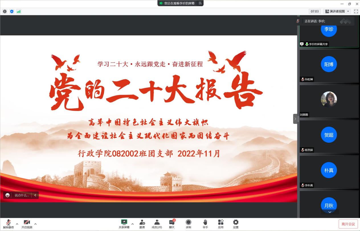 2022年10月16日,中国共产党第二十次全国代表大会在京开幕,习近平总书记代表第十九届中央委员会向大会作了报告,报告分析了国际国内形势,回顾总结了过去五年的工作和新时代十年的伟大变革,全面部署了未来五年党和国家事业发展的大政方针。为全面学习贯彻党的二十大精神,鼓励青年同志踔厉奋发、笃行不怠,行政学院2020级各班团支部开展了主题为“学习二十大,永远跟党走,奋进新征程”的团日活动。