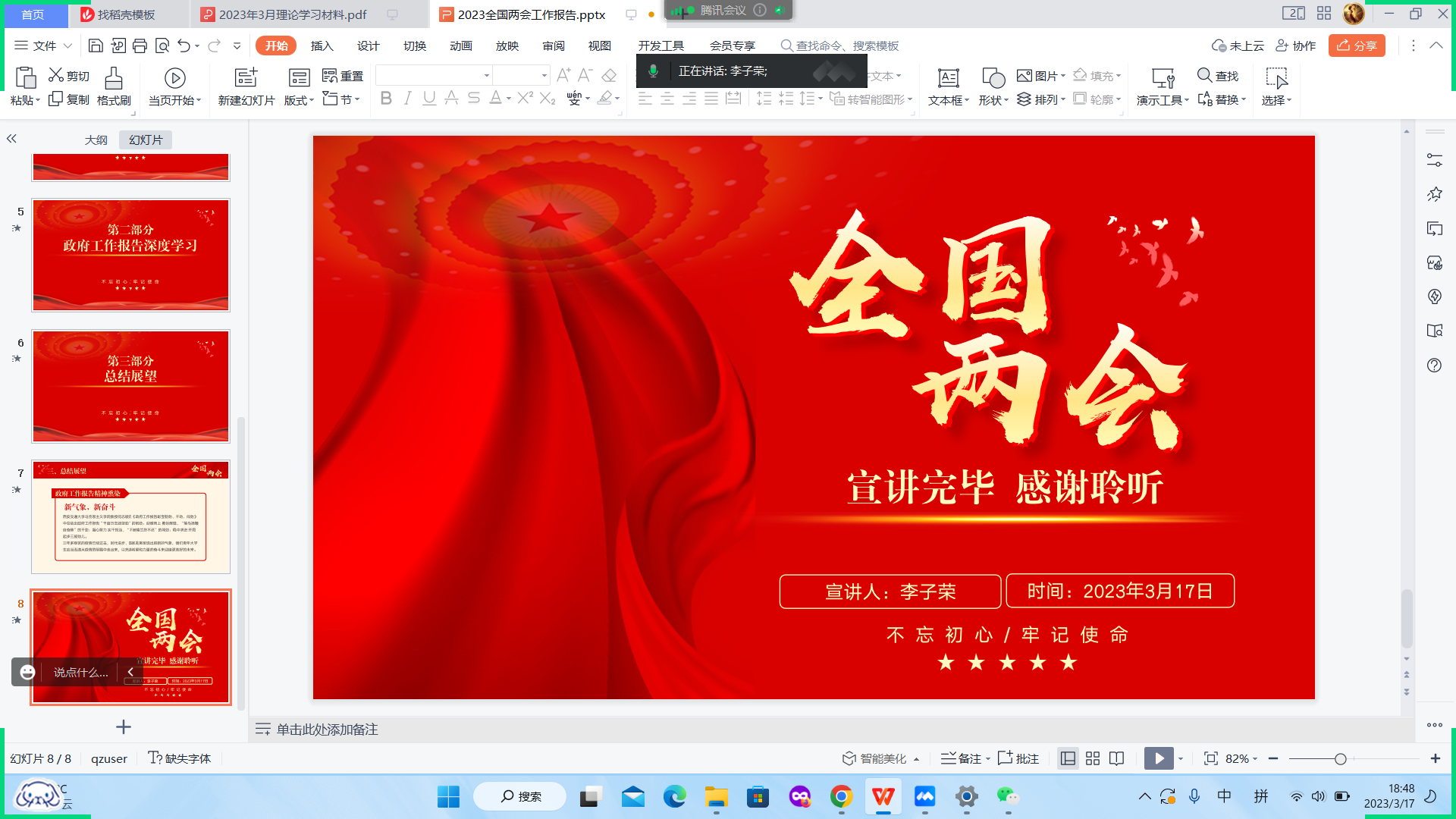 总之,同学们在本次团课过程中认真学习和领会到了两会精神,感受到了强国建设民族复兴的磅礴力量。也更加明晰了大家怀抱梦想又脚踏实地的实践方向,更加坚定了敢想敢为又善作善成的提升方向。开局知奋进,路虽远,行则将至;事虽难,做则必成。在2023年全国两会精神的倡导和党的伟大领导下,我们必会坚持以中国式现代化全面推进中华民族伟大复兴,朝着全面建成社会主义现代化强国的宏伟目标奋勇前进!(图文:2020级团支书及宣传委员 责编:行政学院学生会新闻宣传部)