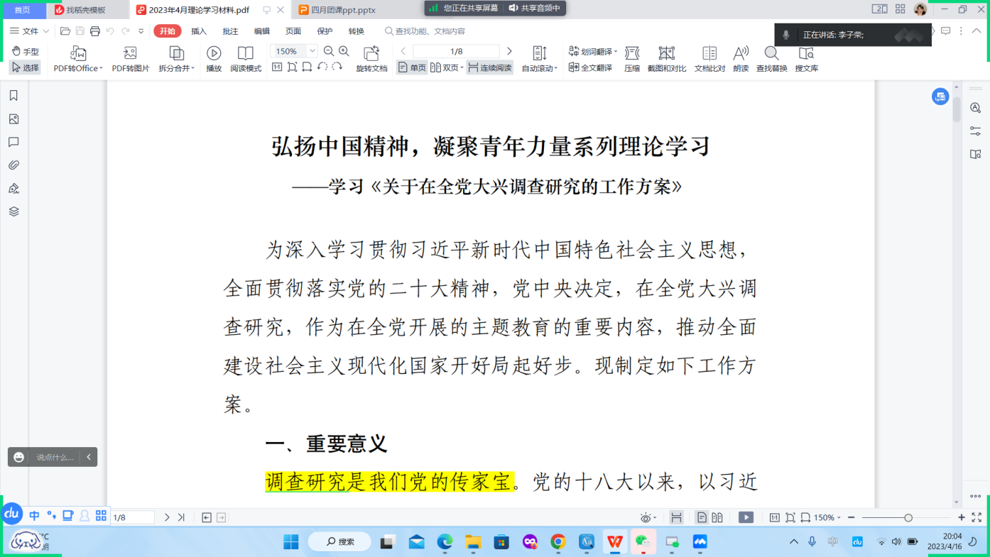 本次活动包含学习解读,交流分享,总结收获三个环节,其间同学们认真思考、积极参与,活动基本取得了理想效果。活动伊始,由各班团支书带领同学们共同研读学习了《关于在全党大兴调查研究的工作方案》,并深入阐述了毛泽东反对本本主义的理论框架,引领同学们进一步明悟大兴调查研究的总体要求与重要意义。在交流分享环节,同学们进行了自由交流,分享自己的学习认识与心得体会,李子荣(2020级本科生)围绕毛泽东反对本本主义的主要内容,指出反对本本主义的法宝在于大兴调查研究之风。应强调实践、批判形式主义和一切不良思想倾向,加强群众路线,恢复马克思主义普遍原理的权威性,使马克思主义适应中国具体情况。杨天硕(2020级本科生)则立足党的十八大以来改革发展环境,表示我国发展正面临新的战略机遇、新的战略任务与新的战略要求。国内改革发展稳定面临不少深层次矛盾躲不开、绕不过,各种风险挑战、困难问题比以往更加严峻复杂,唯有调查研究便是做出正确决策解决这些问题的正确前提。在本次团课活动的最后,同学们就本次学习内容进行了交流,踊跃分享了自己关于学习贯彻《关于在全党大兴调查研究的工作方案》的心得感悟,并表示将持续深入了解调查研究之法的实际效用与重要意义,通过对其方法手段的不断完善,推动对各地区、各部门、各领域的实际情况的深入了解与群众问题的科学处理,进一步实现维护人民群众利益,稳定国家发展大局。