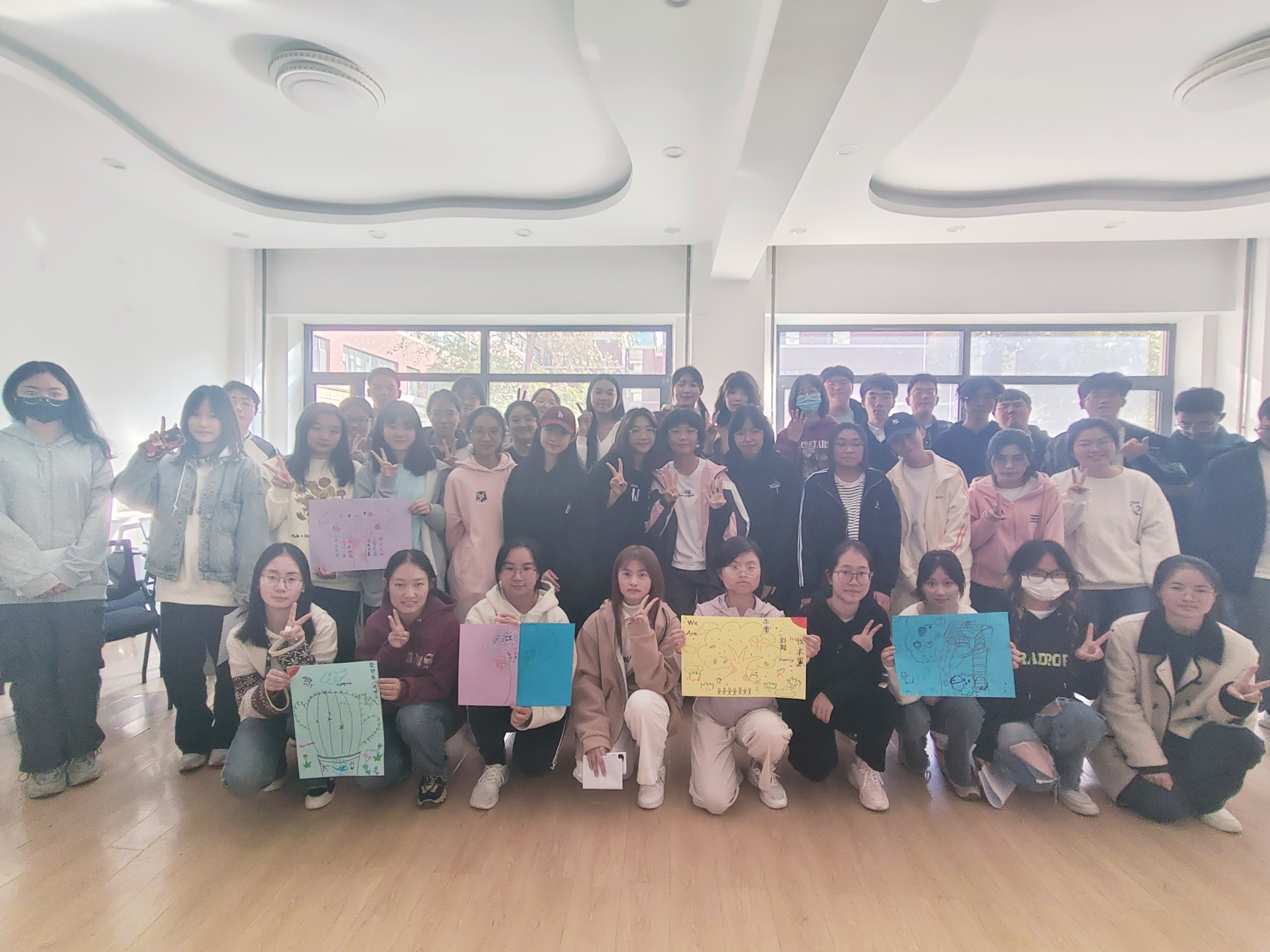 本次主题班会系列活动主要分为以下几个阶段:首先是热身阶段,在一分钟鼓掌中,同学们用热烈的掌声迎接大学生活。其次是“我知道”环节,在小组内同学们互相进行自我介绍,然后再随机抽取同学,其他同学大声说出对他(她)的了解。然后是“集体登陆”环节,主要考验同学们的集体合作能力,小组成员需要相互配合,共同站在一张报纸上方为成功。随后的“人体字母”游戏受到了同学们的热烈欢迎,大家共同谋划,互相协作,用身体搭建起“HAPPY”、“HOME”等单词,感受到集体合作的快乐。在活动最后,每个小组绘制心中的团体树,并集体合影留念。心理团辅活动在欢声笑语中走向结束。