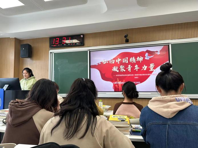 第三环节,分享交流。苍一宁(2023级本科生)联系现实,从日常生活助推现代化的角度入手,提出了青年一代推动实现中国式现代化的现实途径。刘玉馨(2023级本科生)、张雪伦(2023级本科生)围绕此次会议内容积极发言,并指出同学们要敏锐洞悉前进道路上可能出现的机遇和挑战,以科学的战略预见未来、引领未来,为建设富强民主文明和谐美丽的社会主义现代化强国而奋斗。最后,各班团支书总结同学们的发言,号召大家始终做到实心干事业、尽责担当,始终做到热心为青年、朝气蓬勃,始终做到虚心求革新、清澈纯粹,切实当好新时代党的忠实助手和可靠后备军。