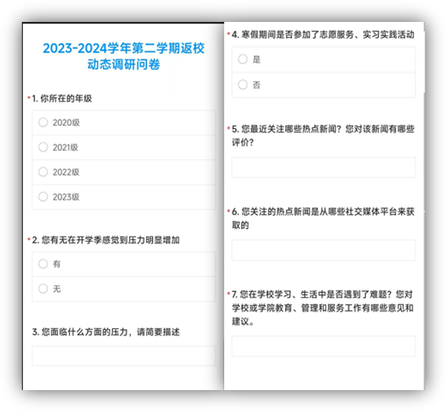 座谈会之前,学院在本科学生中发布思想动态调研问卷,结果显示,50.3%的学生表示在老师、家长的关照下情绪稳定、状态良好,学习生活等各方面并无压力;49.7%的学生表示目前面临压力,总结压力来源,与学生成长培养过程息息相关,低年级学生压力多数来源于开学调整、学业及日程生活压力;高年级学生压力多数来源于升学、就业及毕业论文等。同时,问卷显示,学生普遍关注全国两会、经济形势、国际关系、体育等时事内容,主要以抖音、微博、微信、B站和小红书为热点新闻获取平台。