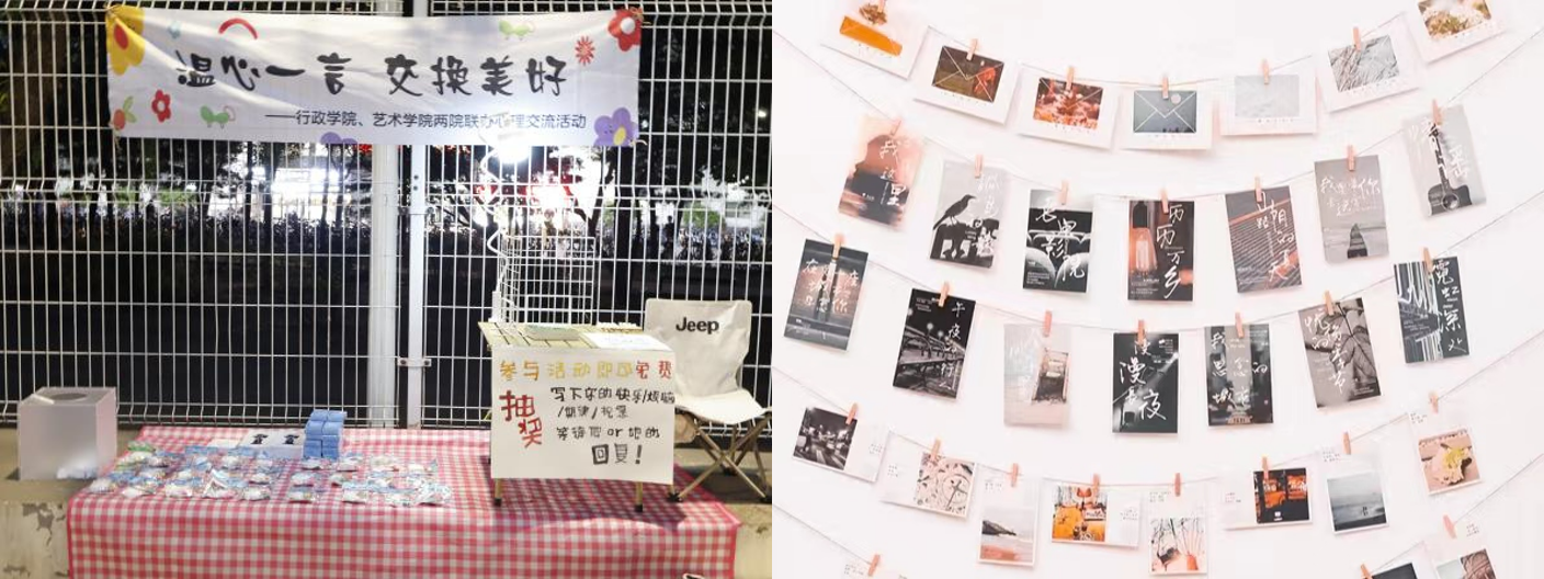 “要切实提高思想认识,以对国家和民族未来高度负责的使命感,以时时放心不下的责任感,紧密结合当前学生心理健康现状和发展趋势,全面加强和改进新时代学生心理健康工作,培育理性平和的健康心态,加强人文关怀和心理疏导”——5月17日、18日,行政学院、艺术学院联合举办“温心一言,交换美好”心理交流活动。此次“温心一言、交换美好”活动,通过在南区操场设置“心情交流墙”、悬挂“心灵明信片”的方式,为同学们提供了一个分享心情、交流情感的心理平台,引导同学们感受生活的温暖和美好。在活动过程中,同学们纷纷敞开心扉,书写悬挂自己的“心灵明信片”,分享生活、倾诉烦恼焦虑、祝福路人、展望未来,留言互动间展现出彼此间友好的善意与关怀。辅导员经常性深入学生公寓、教室、体育场馆和餐厅,保持与学生群体的密切联系,在建立友好互信的基础上,定期摸排了解学生思想动态、评估学生心理健康状况,结合院级心理辅导室随时开展谈心谈话、开展心理科普,帮助同学们加强情绪管理、排解焦躁忧虑,共同营造安心、舒心、开心的学习生活氛围。
