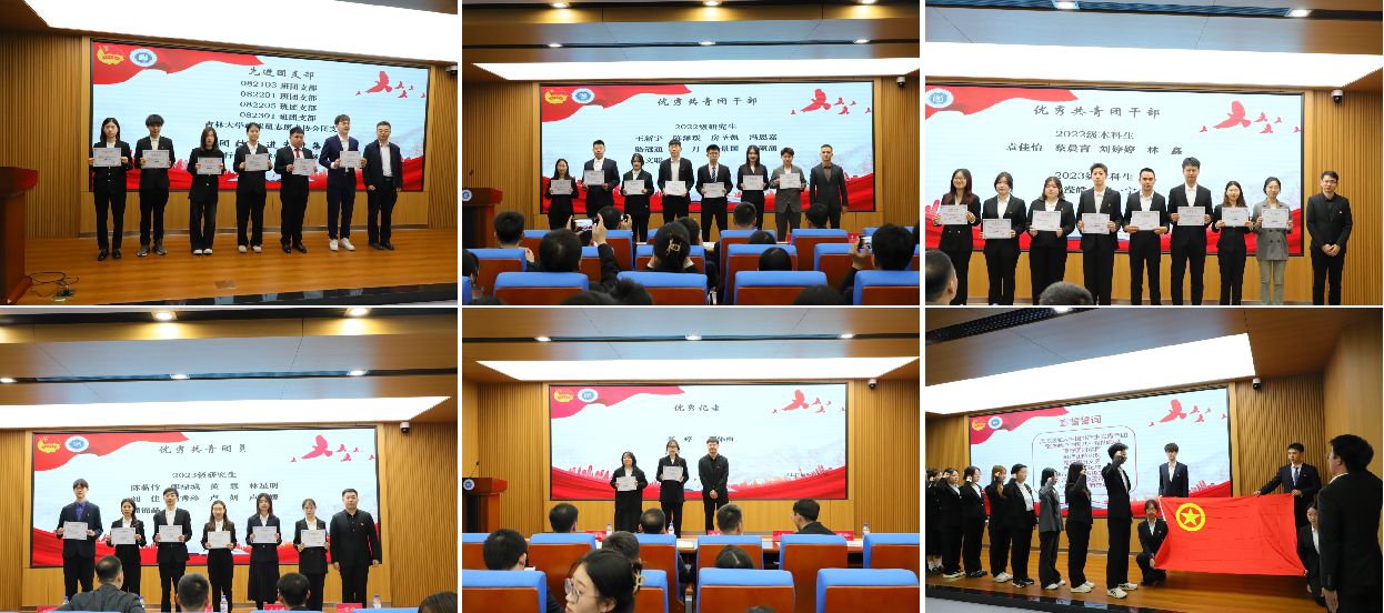 “广大青年要继承和发扬五四精神,坚定不移听党话、跟党走,争做有理想、敢担当、能吃苦、肯奋斗的新时代好青年,在推进强国建设、民族复兴伟业中展现青春作为、彰显青春风采、贡献青春力量,奋力书写为中国式现代化挺膺担当的青春篇章。”——5月14日,共青团吉林大学行政学院委员会于东荣大厦人民政协理论研究中心报告厅举行2023年度“创先争优”表彰大会,新入团青年面向团旗郑重宣誓,全体与会青年重温入团誓词。行政学院党委书记陈希贵代表学院党委向全体青年师生致以节日问候,对受到表彰的先进个人和团体表示热烈祝贺,并结合学校团委2024年工作要点,着重从着眼全局顺势而动、从严务实固本培元、力争上游以德为先三个方面就进一步加强和改进学院共青团工作提出了意见。在学校2023年度共青团“创先争优”表彰中,学院再次荣获教师优秀团干部、优秀志愿服务组织、寒假社会实践优秀组织单位、优秀学生会,这是一届又一届青年学生骨干的扬弃与传承,是对学院不断深化共青团改革的充分认可,也是对学院团员青年继续大踏步追寻梦想、实现价值的鞭策和激励。