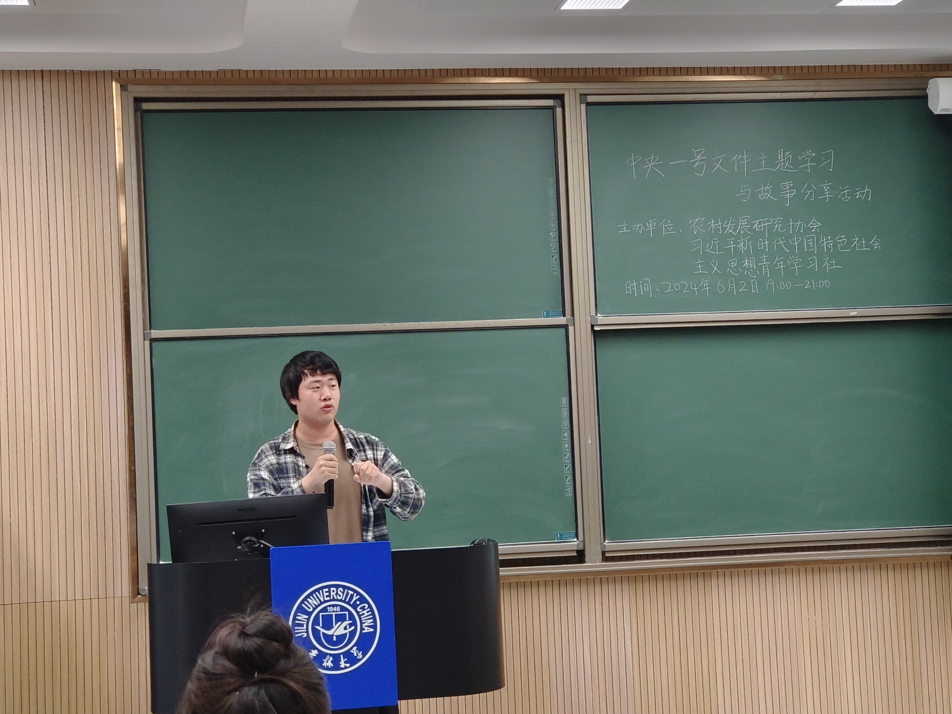 为深入学习《中共中央国务院关于学习运里“千村示范、万村整治”工程经验有力有效推进乡村全面振兴的意见》,激发同学们投身基层,为乡村振兴贡献力量的热情,坚定同学们服务三农、投身乡村建设、实现中华民族伟大复兴的信心与决心,吉林大学农村发展研究协会于2024年6月2日晚在中心校区逸夫楼一阶举办“中央一号文件”主题学习与故事分享活动,主题学习活动刘玉馨(2023级本科生)主持。