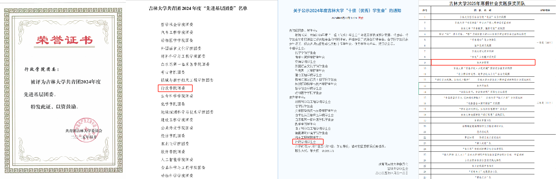 青春孕育无限希望,青年创造美好明天。4月,学院团委在吉林大学共青团2024年度“创先争优”评选工作中荣获“先进基层团委”称号,既是对学院团委年度工作的肯定,也是对未来工作的无限期望。同时,行政学院学生会荣获2024年度“优秀学生会”,学院“吉声新视界”团队荣获2025年寒假社会实践一等奖。