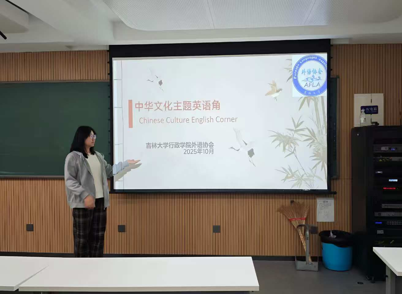为增强文化自信,主动传承并传播中华优秀传统文化,同时借助英语搭建跨文化沟通的桥梁,2025年10月22日,吉林大学行政学院外语协会于前卫校区敬信教学楼A103教室举办“中华文化主题英语角”活动。