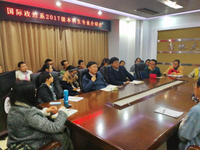 10月13日下午,行政学院国际政治系2017级本科生专业介绍会在东荣大厦1214会议室举行。行政学院副院长、国际政治系副主任于海洋教授担任主讲嘉宾。2017级国际政治专业本科生参加了介绍会。介绍会由院学工办主任、2017级本科生辅导员刘洋主持。