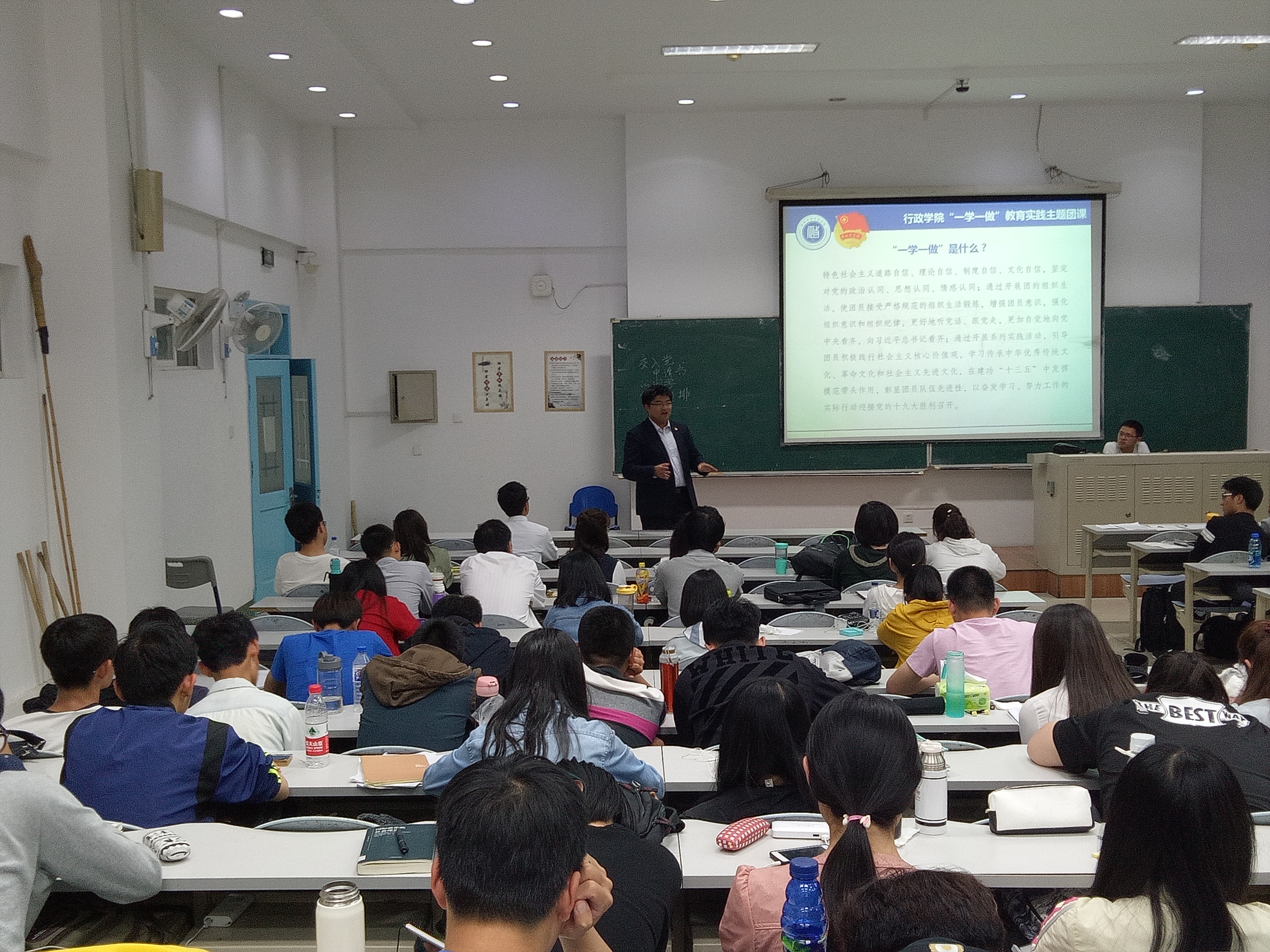 5月24日晚,行政学院学工办主任刘洋老师在中心校区第三教学楼第十四阶梯教室,为学院2016级本科生团员和申请入团的同学们,讲授了以“怎样做一名合格团员”为主题的学院共青团“一学一做”教育实践主题团课。