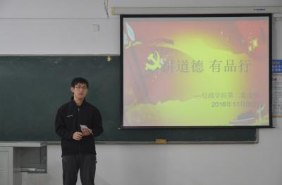 为贯彻落实党的“两学一做”精神,深入学习党的先进理念,11月3日下午13时30分,行政学院本科生第二党支部于前卫南区第三教学楼407室举办了“讲道德、有品行”主题学习交流活动。裴月莹(2014级本科生)担任本次活动主持人,2014级本科生党员、预备党员和入党积极分子参加了本次活动。