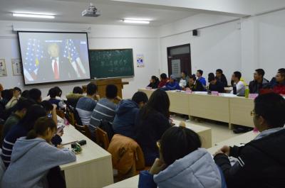 活动于18:30正式开始。首先,主持人上台致辞并介绍本次活动讨论主题,为了进一步了解该主题,主持人播放了关于特朗普竞选的小视频。然后,各代表队内部进行了细致的讨论并总结了看法,大家热情高涨,积极发言。各代表对代表各抒己见,碰撞出了思想的火花。之后,各个代表团之间展开了异常激烈的讨论,互相交换见解。最后,大家合照留念。