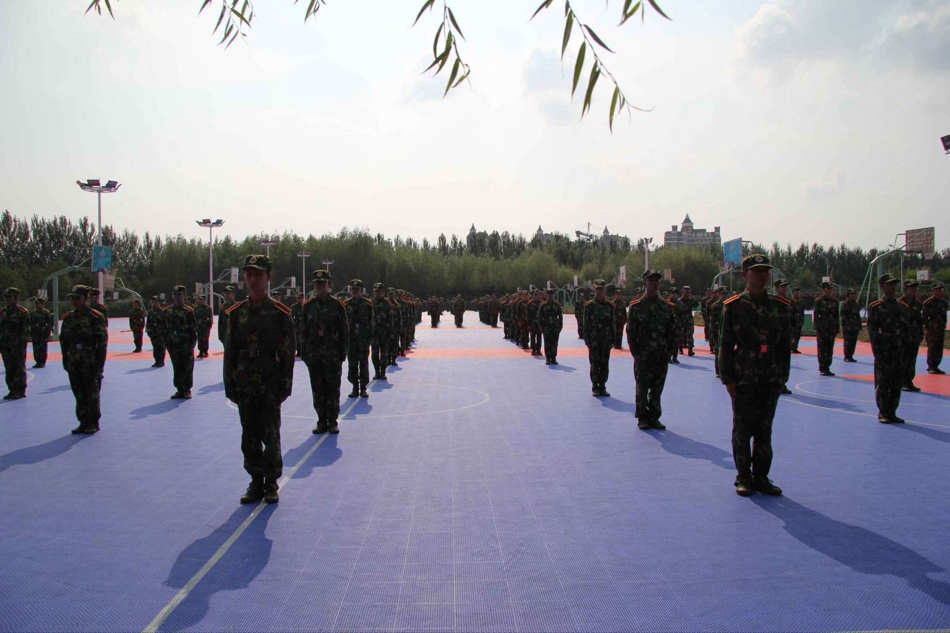 在中心校区的篮球场上,行政学院的新生进行着艰苦的军事训练。他们在教官的指导与带领下认真地完成每一项军训任务,提高自己的军事素质。夜晚的篮球场也有他们的身姿,一套并不复杂的军体拳展现着他们的风采,一首首嘹亮的军歌传达着他们的精神。