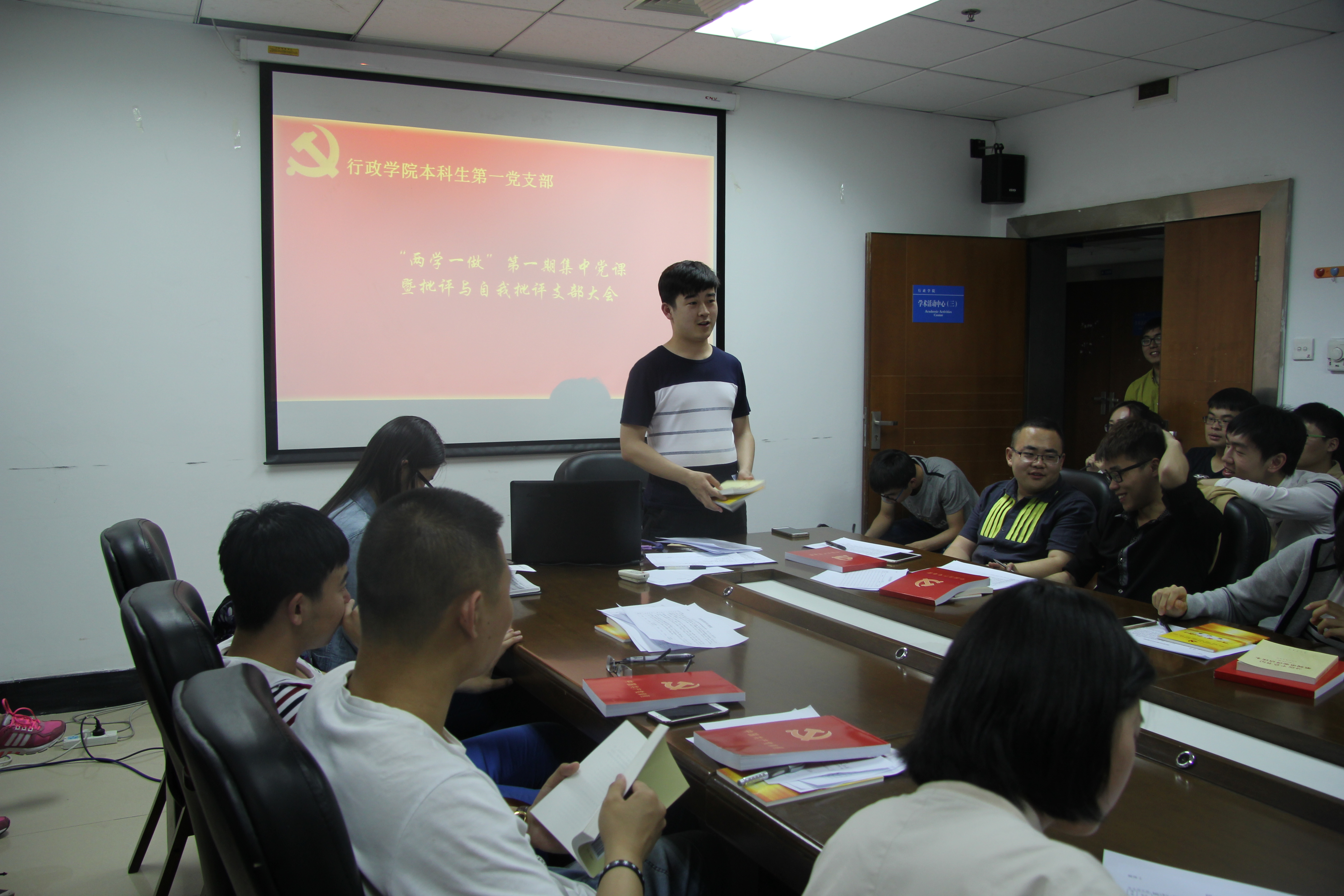 为了贯彻落实党的“两学一做”理念,深入学习党的先进理念,提高党员思想觉悟,用先进的思想武装自身。2016年5月27日18时,行政学院于前卫南区东荣大厦1202会议室开展了“两学一做”第一期集中党课暨批评与自我批评党支部大会。行政学院13级学生任建国担任本次大会主持人,学院学生正式党员6人,预备党员19人,19名入党积极分子参加了本次大会,由学院15级学生陈祺然作会议记录。