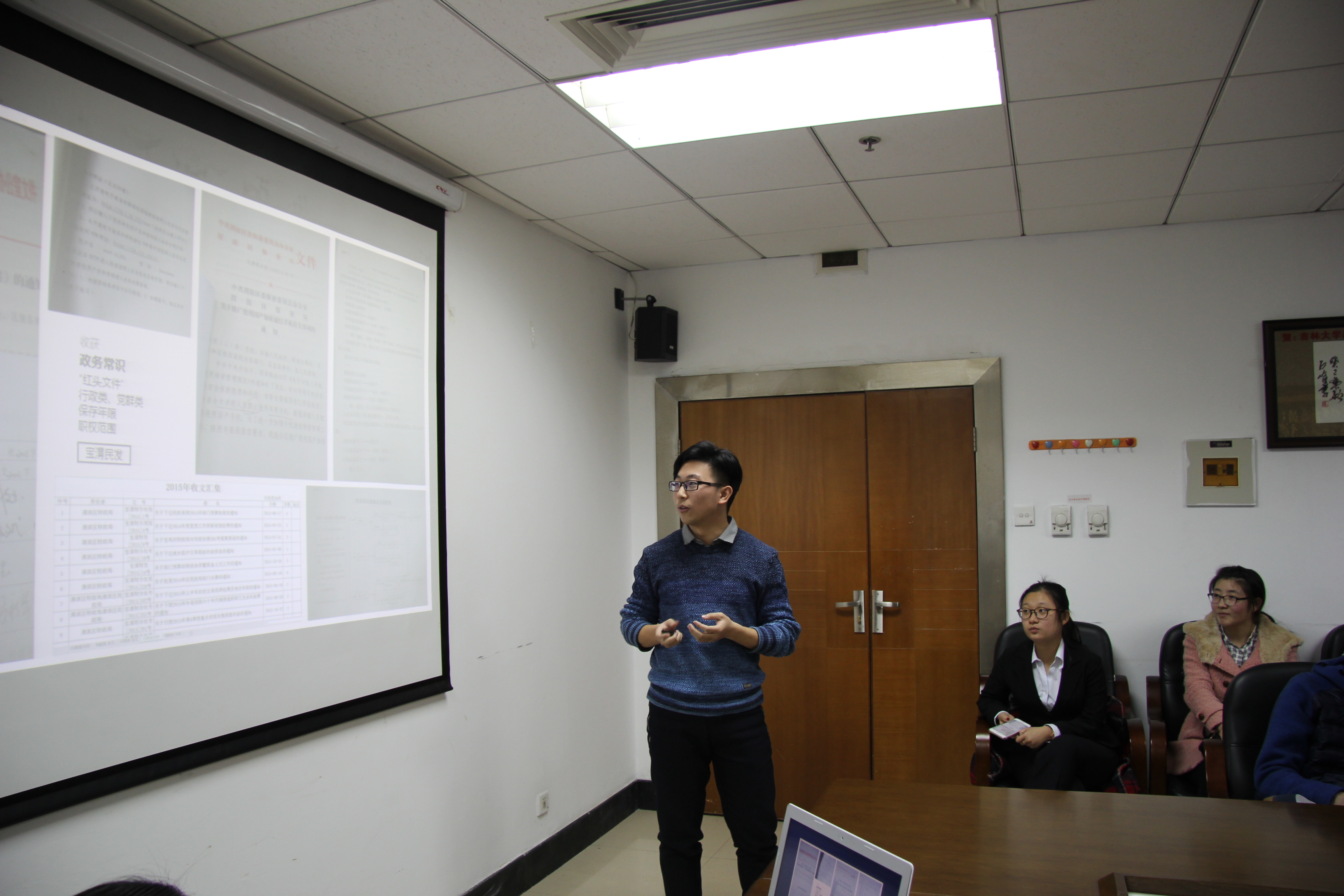 会议于下午六点正式开始。首先,曲畅竹进行讲话,对寒假期间同学们积极参与实践调研的精神表示赞赏,强调大学生要将专业知识与社会实践相结合。接下来共有九组成员分别展示了自己的实践成果。有六个小组关注了当前中国农村问题,他们从农村基层政治组织、经济发展、教育医疗等方面对农村居民的生活现状进行了较为全面的调查与分析,并针对相应问题提出了解决方案;另有两个小组分别在政府部门进行实习,实地地感受政府办公流程,亲身体验政府工作内容,用切身的实践来感受政府的行政方式;最后一个小组对当前的雾霾情况进行了调查、分析,并分别从政府与公民各自的职责方面进行总结并提出了建议。会议最后,孙超群对会议进行总结,对各组的实践成果给予了充分肯定,同时又在PPT制作与语言表达方面对各组成员提出建议。