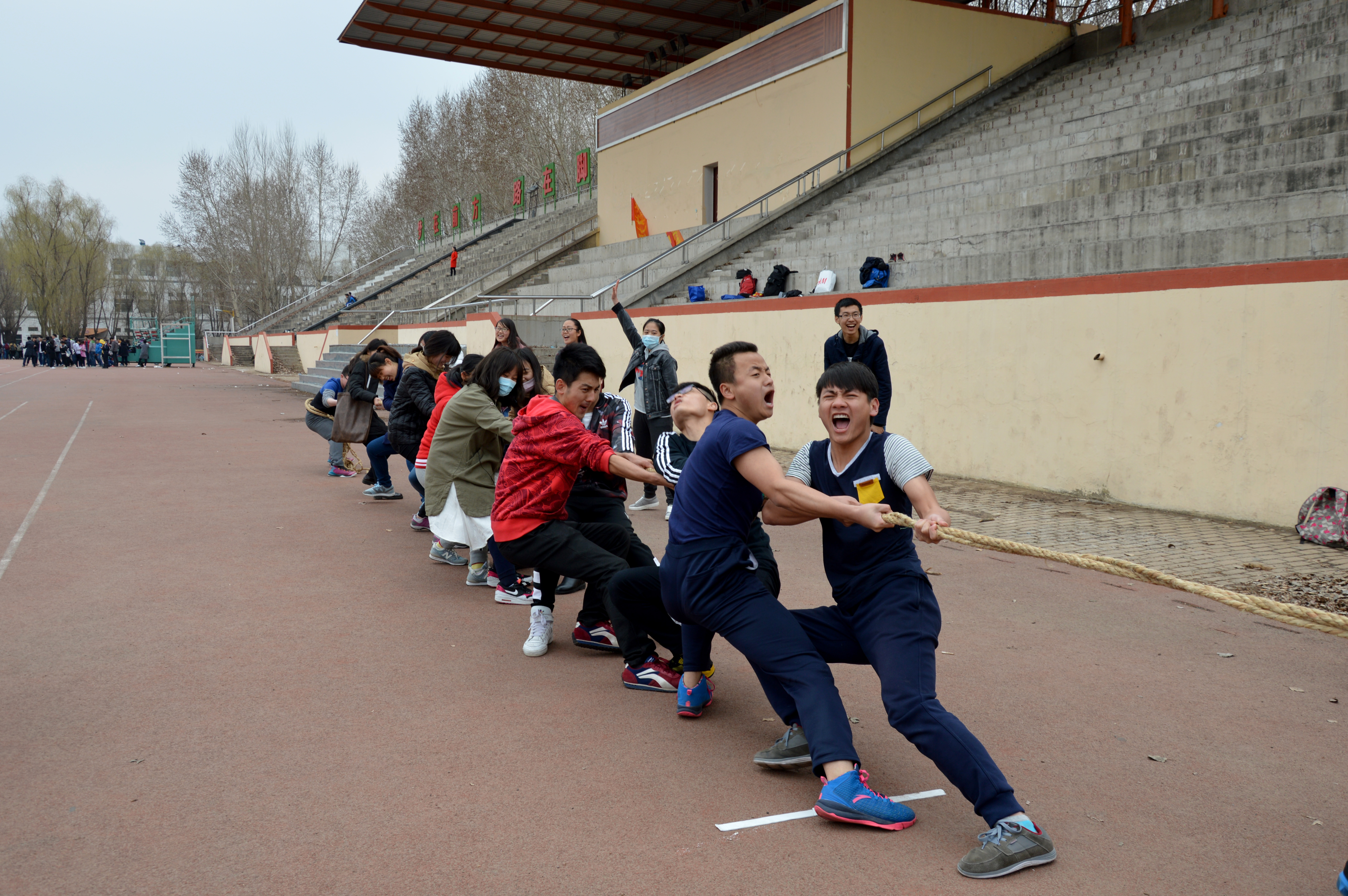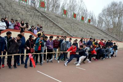 12时整,参赛同学和啦啦队同学准时到达体育场。比赛前,学生会体育部工作人员姜雨男(2015级)宣布了赛事安排和比赛规则。比赛共分为4组进行:081401班VS081402班、081403班VS081404班、081501班VS081502班、081503班VS081504班,规则为一局定胜负。比赛正式开始,各个队伍都喊着自己的口号,以便保持着同样的节奏,朝一个方向用力拉。啦啦队的同学们也在大声为自己的班级加油助威,比赛进展的如火如荼。4组赛事中081503班VS 081504班的比赛最为激烈。比赛一开始,双方势均力敌,两班各自啦啦队的呐喊声和助威声此起彼伏。渐渐地3班占有了相当大的优势,胜利在望。然而在最后关头4班队伍依然没有放弃,在班长的口号指挥下,4班参赛同学齐心协力,每个人都尽了自己最大的努力,最终成功逆转,获得了比赛的胜利。此次获胜的班级为081402班、081404班、081502班和081504班。