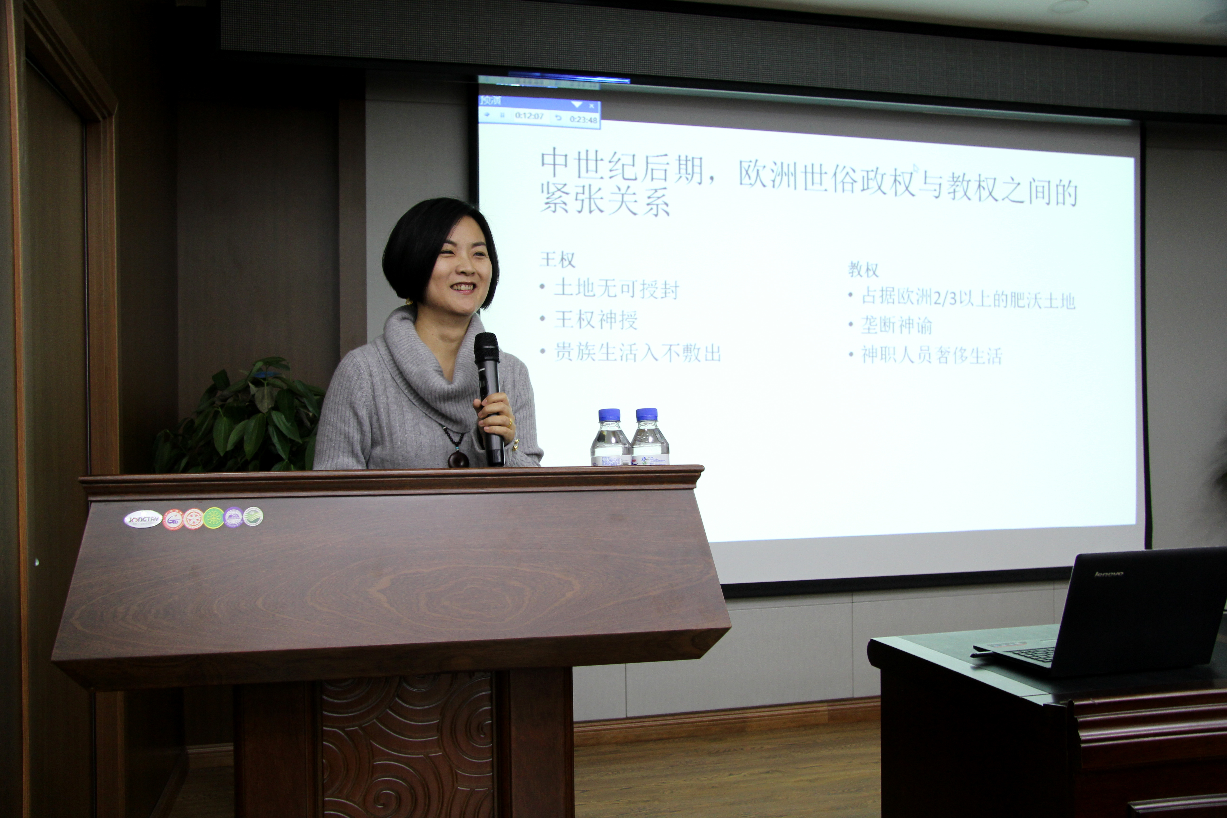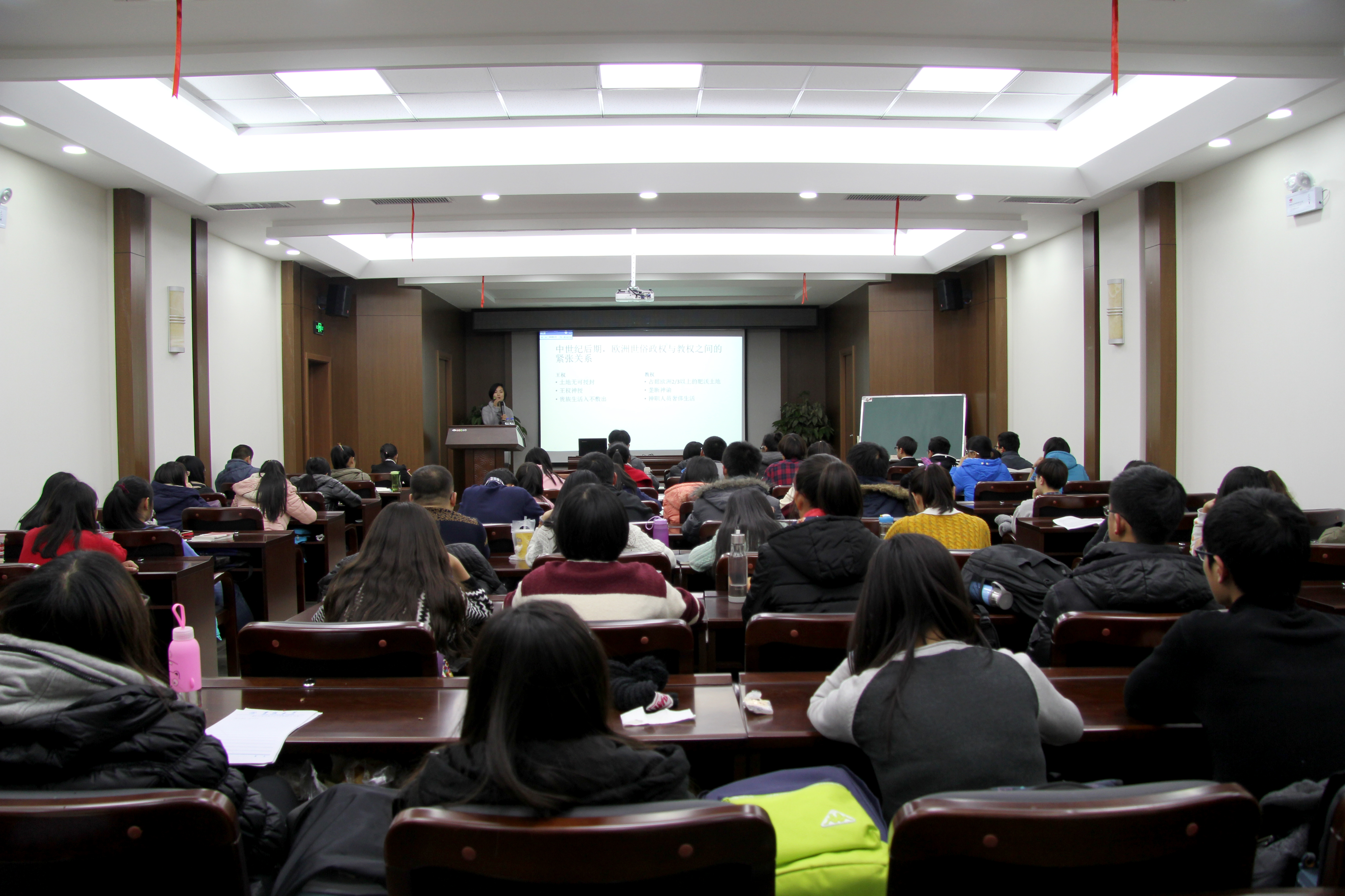 在此次“知行大讲堂”讲座活动中,围绕西方资本主义的产生与近代平等观的形成这一主题,薛洁从政治、思想、经济领域的嬗变来剖析近代西方资本主义产生的社会条件。她着重讲述了资产阶级的兴起,使同学们对西方资本主义的产生和发展有了更为深刻的认识。在讲授过程中,薛洁运用诙谐幽默的方式激发了同学们强烈的学习兴趣,博得了同学们阵阵热烈掌声。讲授结束后,活动进入解疑答惑环节。薛洁对学生所提的关于西方中世纪时期教权王权博弈状况、英国平等观念的发展等问题给出了自己的解答。师生之间的良好互动将讲座推向了高潮。讲座活动历时一个多小时,在同学们热烈的掌声中圆满结束。