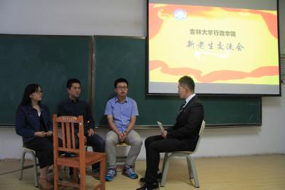 为了加强新老生之间的交流与沟通,帮助新生更快适应大学的学习生活,2015年9月21日上午8时学院于吉林大学前卫南区李四光教学楼107教室举办了新老生交流会。行政学院本科生辅导员曲畅竹老师应邀出席本次活动,学院主要学生干部及2015级全体新生参加本次交流会。本次交流会由代铭浩(2014级)、李天一(2014级)主持。