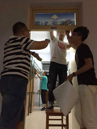 开学临近,为保证2015级新生能够顺利入住寝室,行政学院于8月26日组织学生干部对新生寝室进行了门楣、床铺信息单的张贴以及寝室设施检查工作。本科生辅导员曲畅竹,2015级新生代理班主任孙诗淇、方敬元、郝瑞琪、陈博以及其他学生干部参与了张贴工作。