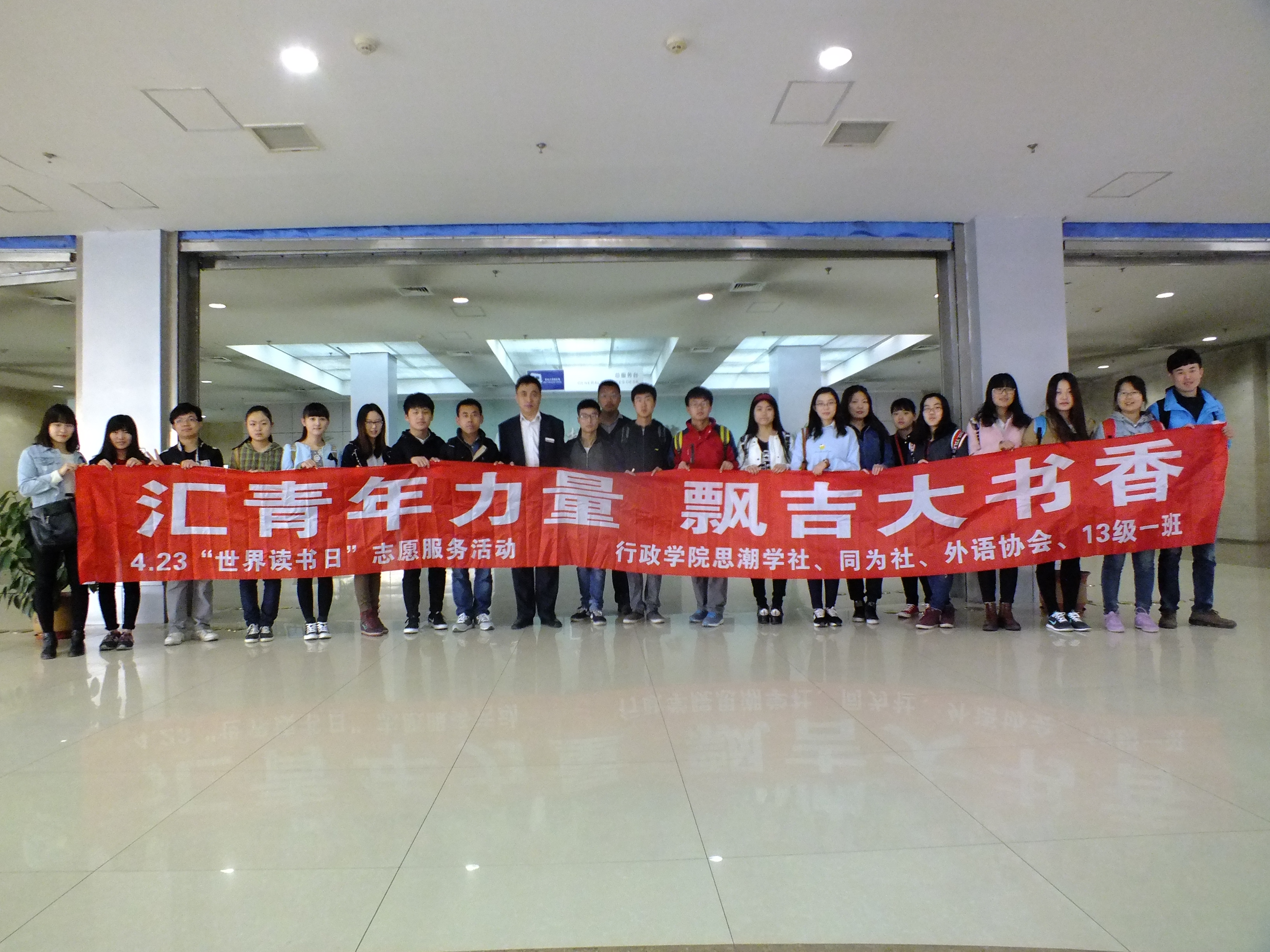 在世界读书日到来之际,为了宣扬读书理念,倡导更多同学培养读书的好习惯,4月23日,吉林大学思潮学社联合同为社、行政外协,以及行政学院081301班共同在前卫南区图书馆开展了以“汇青年力量、飘吉大书香”为主题的读书日系列活动。南区图书馆流通部负责人闫智作为特邀嘉宾出席了本次活动。