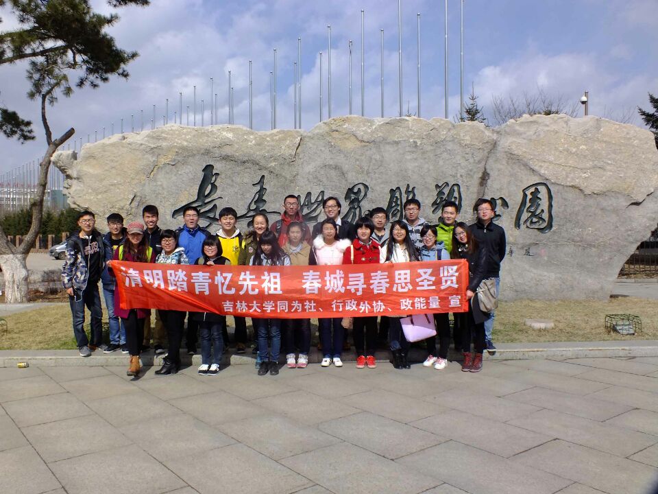 为丰富假期生活,弘扬民族文化。2015年4月6日,行政学院同为社、外语协会、政能量社团于长春世界雕塑公园成功举办了清明踏青活动。这次活动得到了各社团成员的积极响应。除此之外,081404班的同学们也积极参与了本次活动。