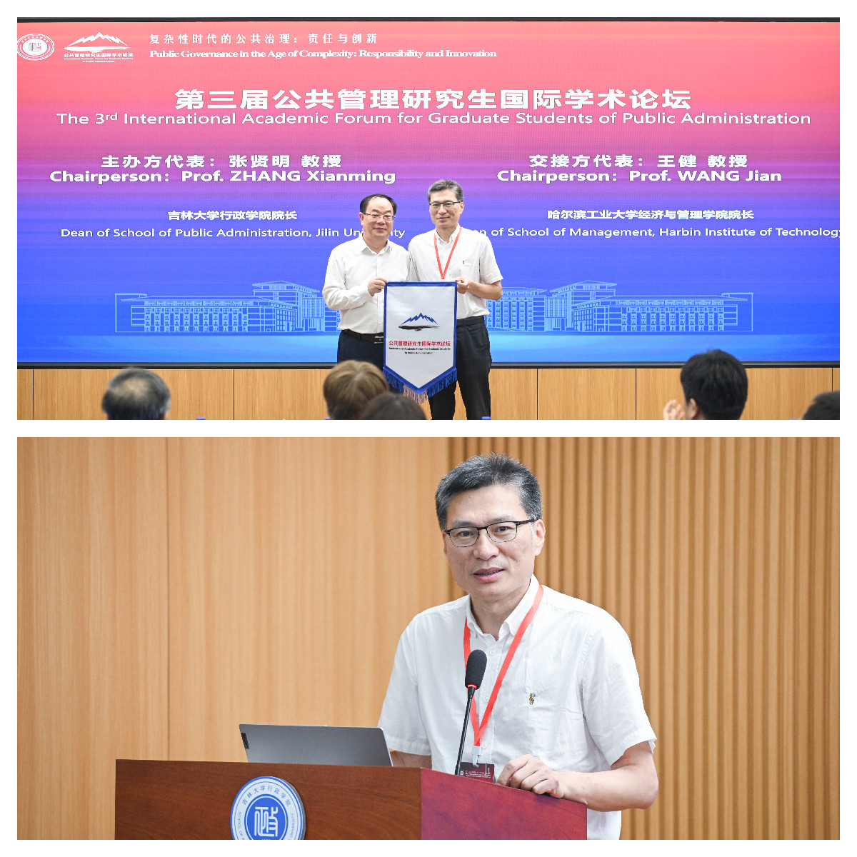 主办权交接仪式上,张贤明教授作为主办方代表,与第四届论坛主办方哈尔滨工业大学经济与管理学院代表王健教授进行公共管理研究生国际学术论坛会旗交接。王健表示,前三届公共管理研究生国际学术论坛的成功举办,是公共管理学科学术质量发展的重要标志,哈尔滨工业大学将学习第三届论坛线下举办的成功经验,作为下一届论坛主办方代表,诚挚邀请在座师生共赴哈尔滨之约。