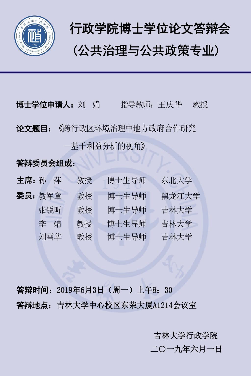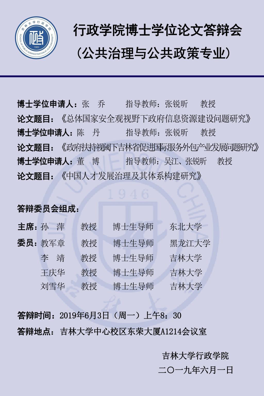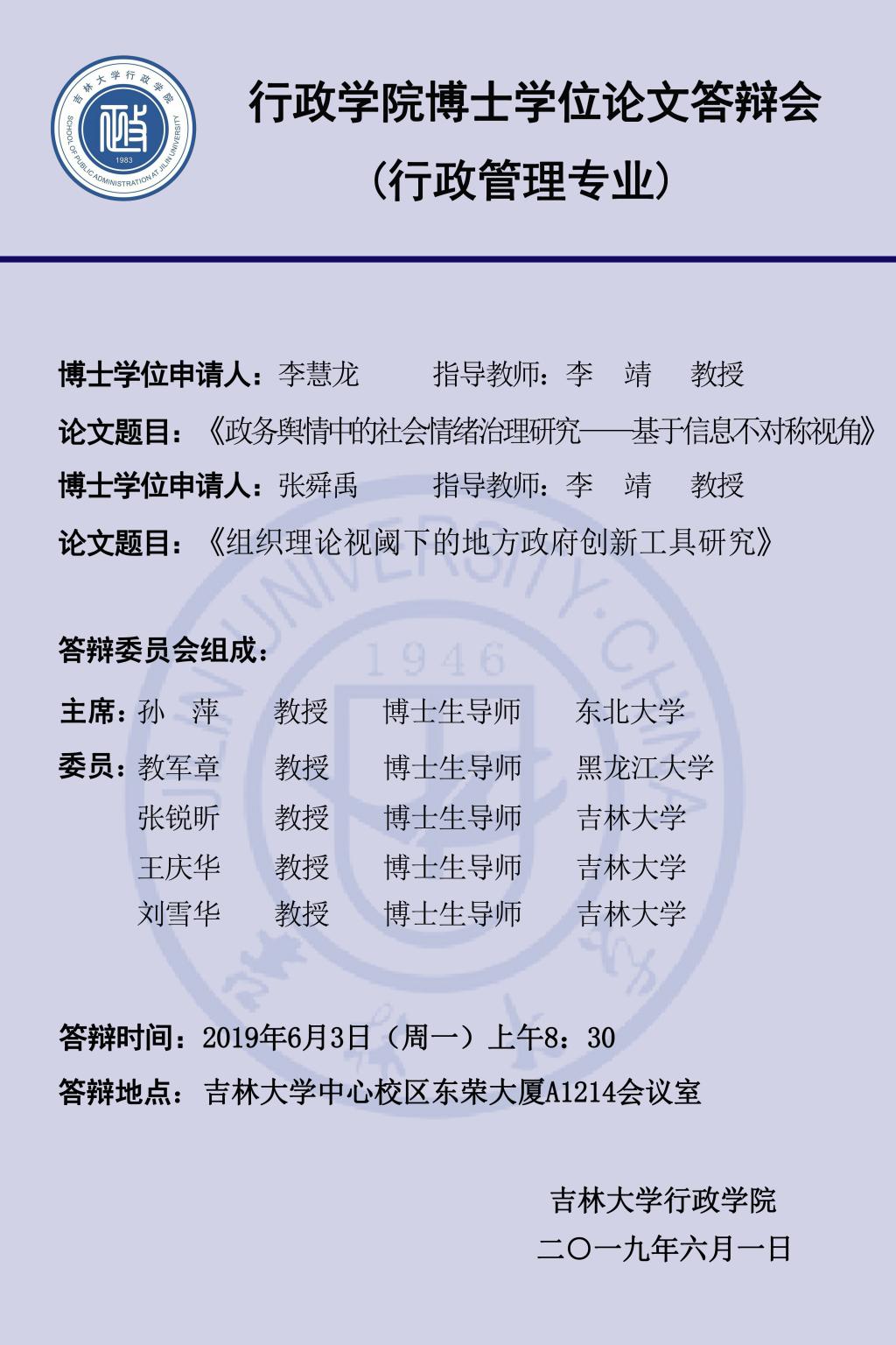 上一篇:吉林大学行政学院2019年上半年博士学位论文答辩会(第六组:行政管理专业、公共治理与公共政策专业)