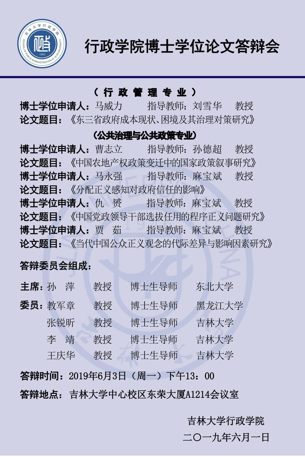 下一篇:吉林大学行政学院2019年上半年博士学位论文答辩会(第五组:行政管理专业、公共治理与公共政策专业)