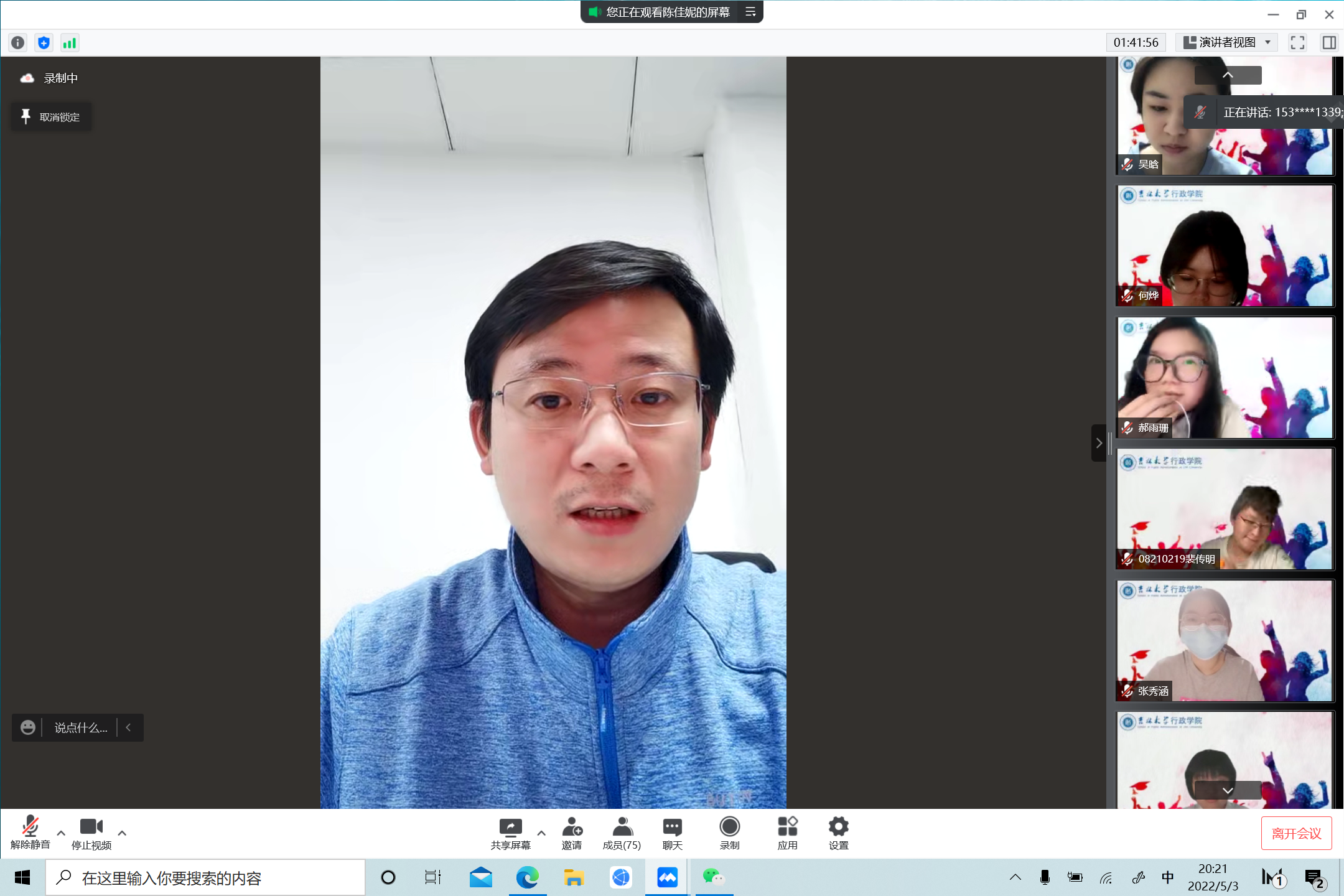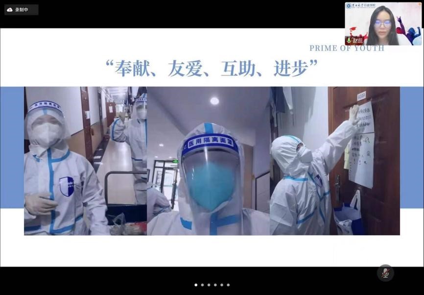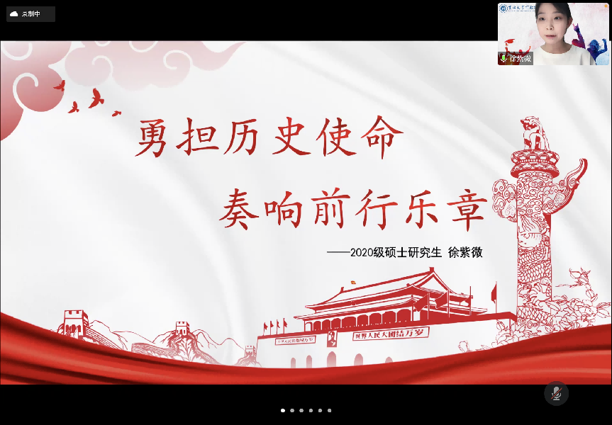优秀学生代表与青年教师代表依次进行了发言。学院“青年学习班”代表曹阳、研究生代表徐紫微分享了学校疫情防控中志愿者的防疫记录和个人心得感悟,提振疫情防控信心;学生社团代表张志强、团支部书记代表张云航总结并介绍了疫情形势下社团与班级工作的开展情况,并结合“五·四”精神鼓励大家追逐青年梦想,争做时代新人;优秀记者代表陈聪表示将为提升学院团委宣传工作而继续努力,立足于“公共精神、独立人格”的院训,加强宣传工作的深度,对内提升亲和力、对外提高影响力;志愿者代表赵蕊、优秀共青团员代表卫玉欣分享了疫情下吉大人、行政人的勇毅担当,表达了对逆行而上、勇挑重担的志愿者的敬意和感谢;学生组织成员代表于润泽介绍了应急管理期间学院学生会的工作开展情况,表示学生会将在未来继续发挥好凝聚同学、服务同学的作用;“青马工程”学员代表王上华分享了自己在院校两级青马工程培训班的经历,并号召共青团员们发挥先锋模范作用,躬身实践、知行合一;“思源计划”学员代表卢婷从参加计划调研活动的经历与体会着眼,抒发了行政学子脚踩泥土、眼望星辰的情怀;就业毕业生代表王鹏解答了同学们关心的就业问题,指出在求职过程中应脚踏实地、积极调整自身心态、不断积累经验,抓住自身定位精准出击。优秀青年教师代表张力伟以责任担当为主题进行了主题发言。张力伟号召同学们坚定思想信念,走出书斋、走向社会,充分认识到自我主体性与对国家民族未来的责任担当,将担当化为行动,勉励同学们立足于青年政治学人、公共管理人的身份,培养理性冷静的学科立场,保持对时代与社会发展的敏感度,在学习实践中挖掘中国故事、更好地阐述中国故事。
