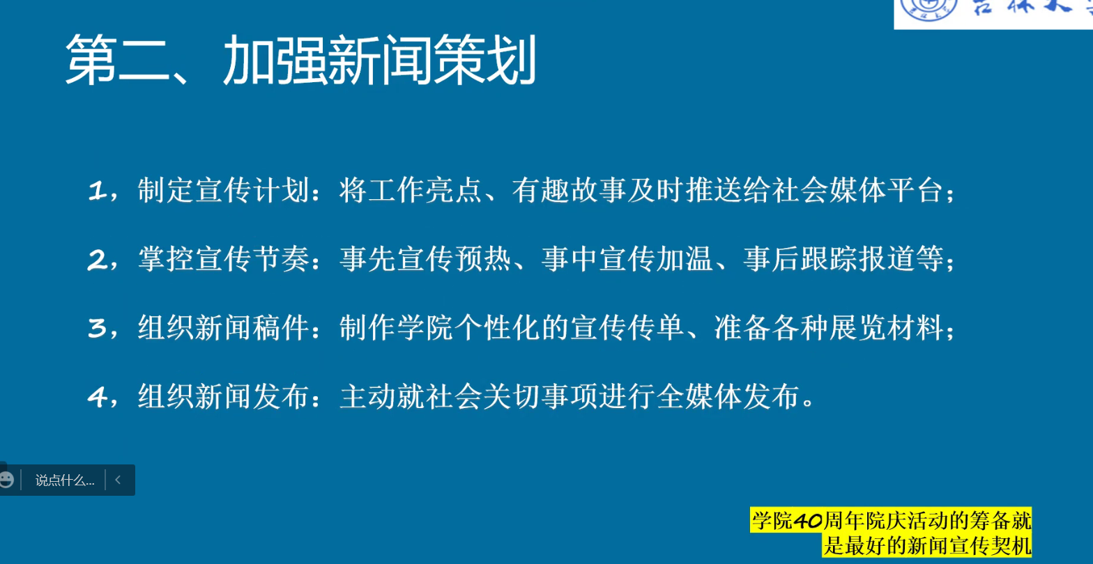 马景惠作总结讲话,通过对党史的回顾,指出要把新闻宣传工作摆在更加重要的位置,跟随党的脚步,保持新闻宣传工作的不松懈。他表示:高等教育立德树人、服务社会的职能是与宣传工作的基本功能并行,行政学院具备良好的前期基础,因而更要在学院发展的传统经验上,进一步完善新闻宣传工作。既要摆好政治站位,明确目标与服务对象,把握宣传工作的方向,又要注重综合能力的培养,以公正客观的态度进行宣传。最后,他代表学院对所有参与支持新闻宣传工作的成员表示感谢。