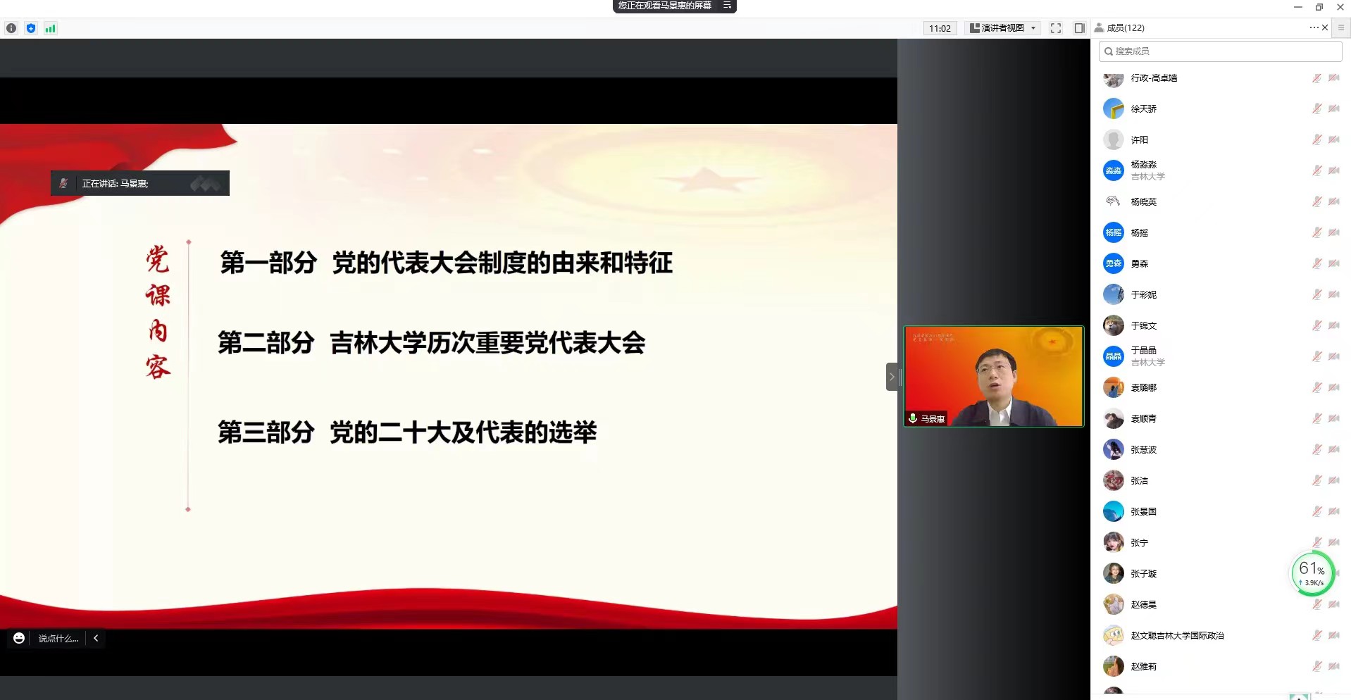 马景惠以党章的历次重要修改为线索,将党的全国代表大会制度分为萌发建立、探索实践、自我完善、发展成熟四个时期,从党的一大耐心讲到党的十九大,通过党的代表大会制度的建立和完善讲述了党内民主政治的发展历程。马景惠指出,党的代表大会肩负或决定党和国家、地方的重大问题及党的建设的重大事项的特殊职责,这就决定了坚持和完善党的代表大会制度不仅关系中国共产党的自身建设,更对整个国家的安全稳定和发展起到关键影响。马景惠以历史的视角和学理和阐释带领毕业生党员重温中国共产党百年恢弘史诗,结合党史学习教育,帮助毕业生党员更进一步加深了对党的民主政治建设的理解。