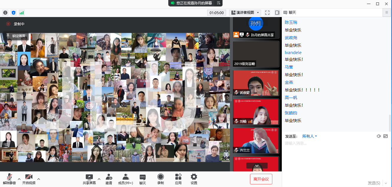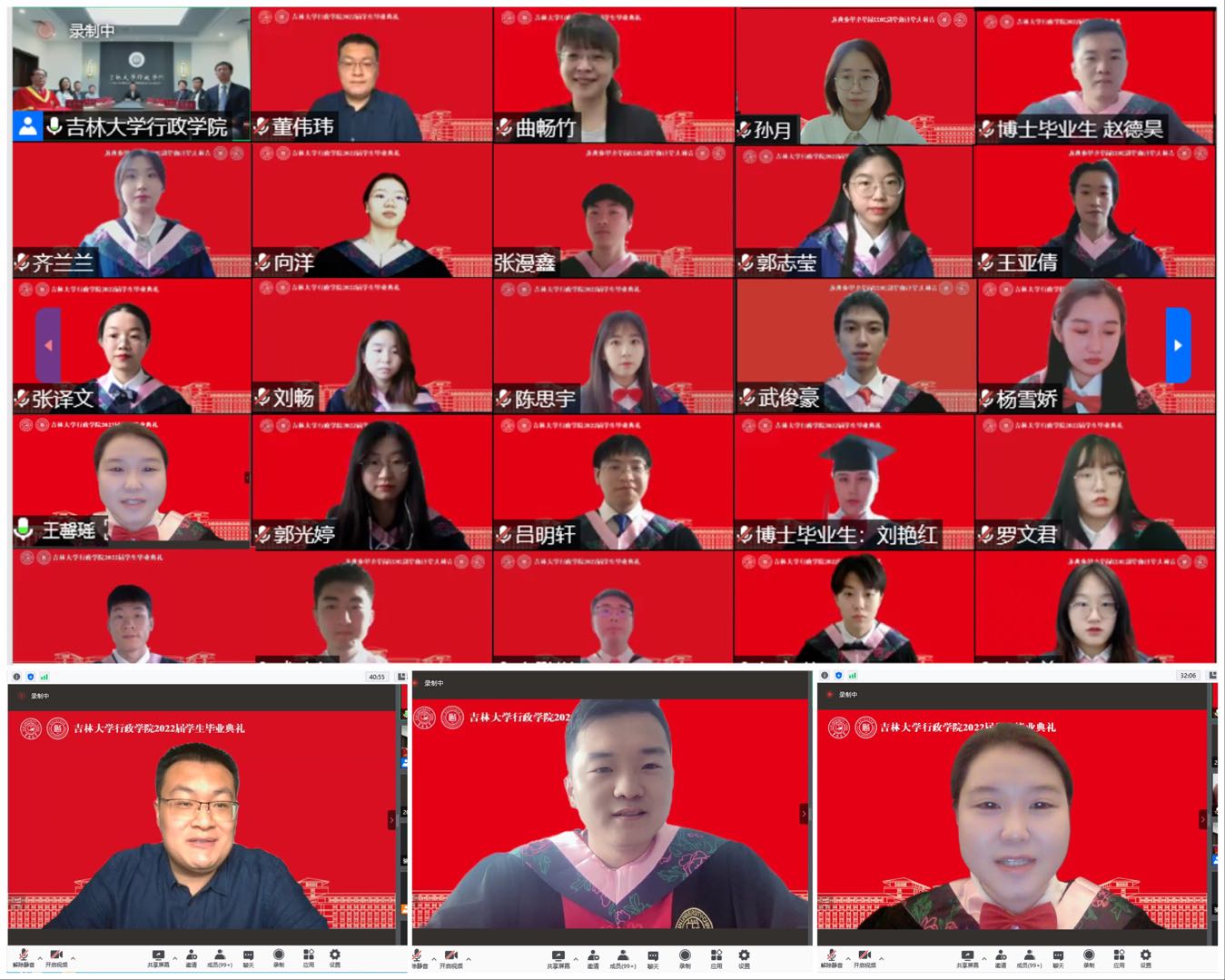 是梦想,正前往,让我们披靡所向;是龙腾,正翱翔,化作岁月的脊梁。吉大几载年华共度,行政青春一生情系,昨天努力奔跑,是为了追上那个曾经被寄予厚望的自己,如今暂时话别,是即将要攀登多少次魂牵梦绕的高峰。典礼尾声时,屏幕展现全体毕业生与老师们洋溢着喜悦与憧憬的照片,全体与会人员在线上合影留念。